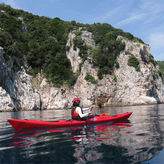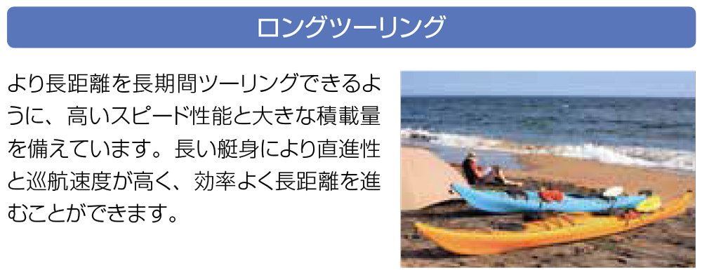 シーカヤックは細く長い形状をしており、高い速度性能と直進性、十分な量のキャンプ用品などを収納できる荷室、進路保持を補助する装置を備えています。海や湖・大河などの長い距離を速く効率よく進むことができ、ショートツーリングに適したモデルとロングツーリングに対応するモデルがあります。
