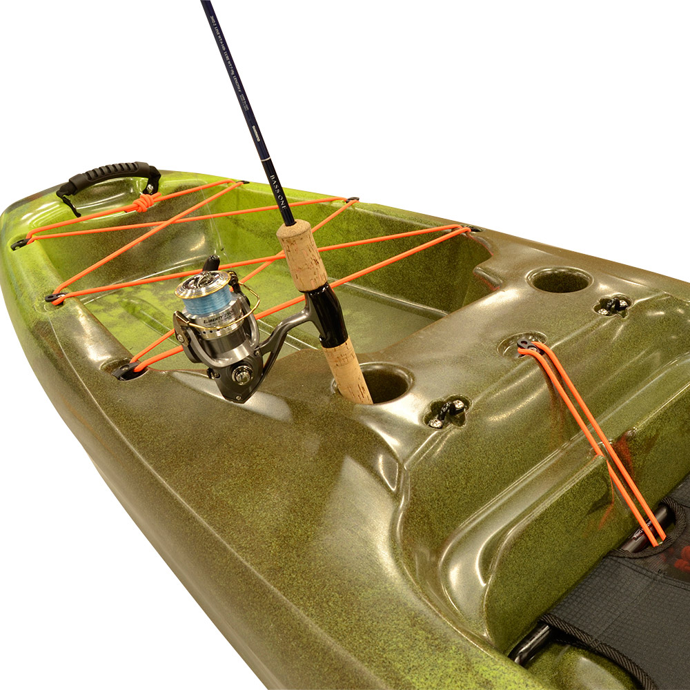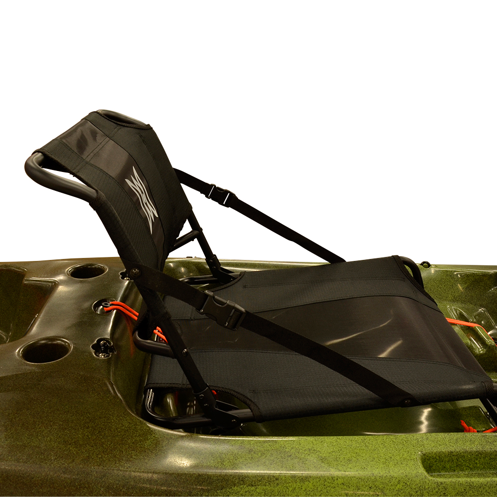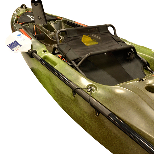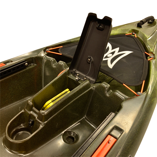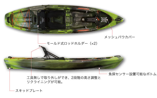 釣り人の期待に応えるべくデザインされた、本格的なフィッシングカヤックです。安定性に優れるフレームシートは、リクライニングも可能なメッシュシートを採用し長時間の釣りを快適にしてくれます。前方2か所のギアトラックスレール、後方のモールド式ロッドホルダーにより拡張性も十分。ボトムに設けた魚群探知機の振動子を設置可能なくぼみは、出艇や上陸時に振動子を引き上げる手間がありません。
