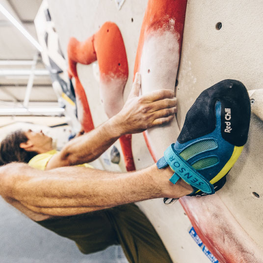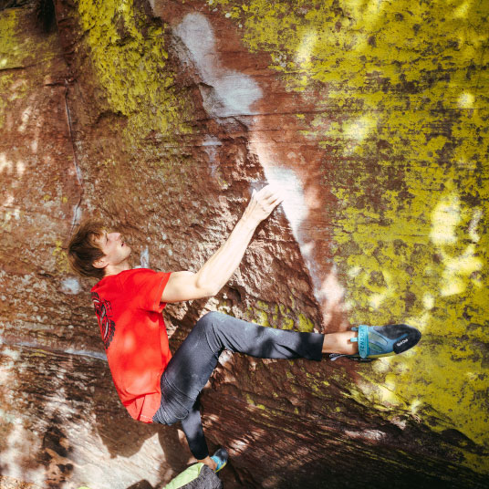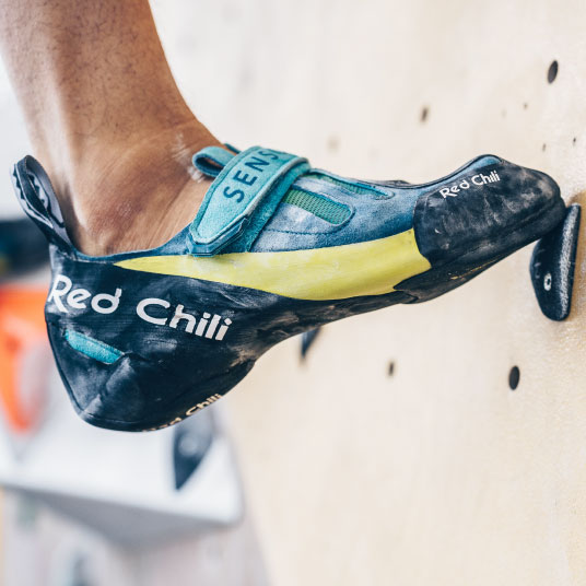 レッドチリのラインナップの中で最も柔らかく足裏感覚に優れたモデル。ミニマルなミッドソールと部位によって厚みを調整したアウトソールの組み合わせによって剛性を保ちながらメリハリのある柔らかさを実現し、足裏でホールドをつかむ感覚を引き出します。モダンクライミングのコンペシーンに対応。