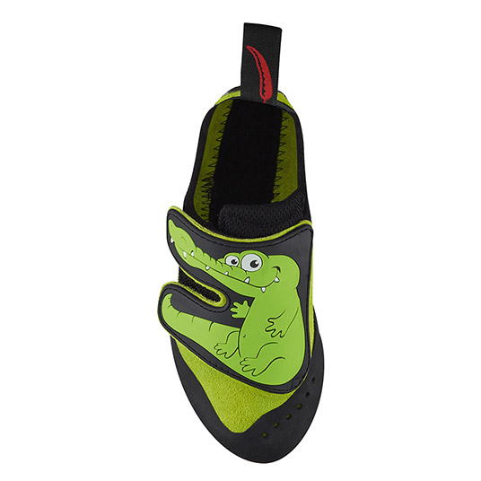 踵の部分が柔らかく可動する構造を備え、お子さまの足の成長に合わせて長い期間快適に着用することができます。ベルクロストラップには可愛らしいワニのモチーフをあしらっています。