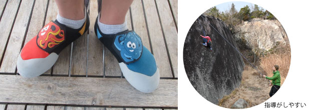クライミング中のフットワークの指導を容易にするために左右でカラーを分けています。赤、青と指示することで、左右が直感的に分からない子どもも理解しやすくなります。