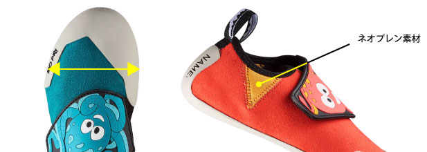子どもの足の発育を妨げないように、つま先にゆとりのあるワイドラストを採用しています。履き口側面には伸縮性のあるネオプレン素材を使い、ヒール部分が必要以上にアキレス腱を締め付けすぎないようにすることで、痛みや違和感のないやさしい履き心地を実現しました。