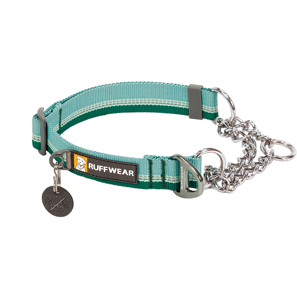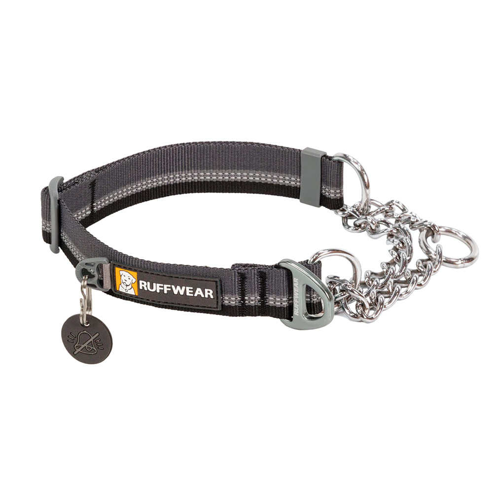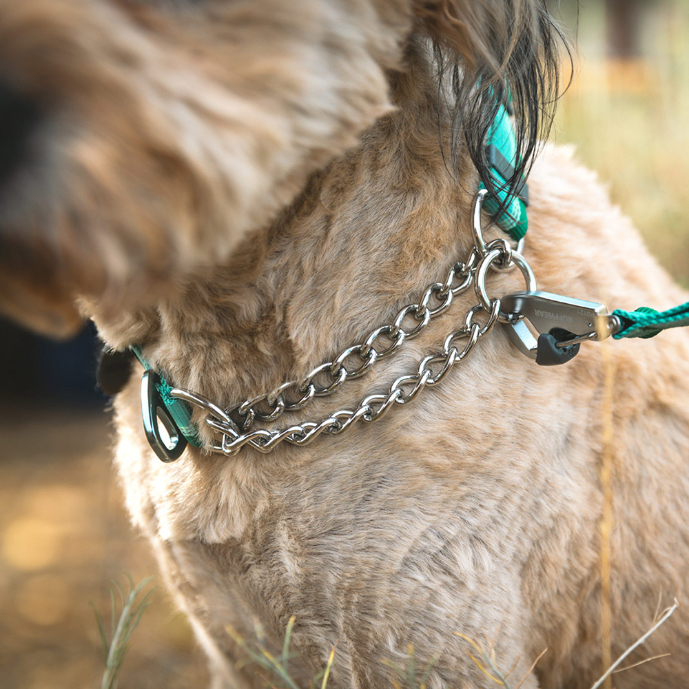 愛犬の急な動きにも首輪が抜けにくいハーフチョークカラー。リーシュはチェーンとVリングどちらにもつけることができます。