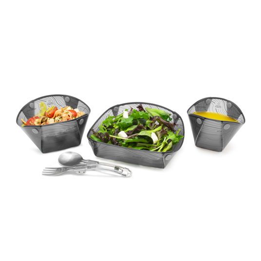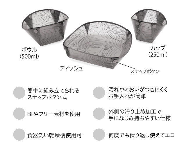折りたたみ食器(カップ、ディッシュ、ボウルの3点セット)です。簡単に組み立てられて、軽量、しかもフラットになり持ち運びや収納に便利。