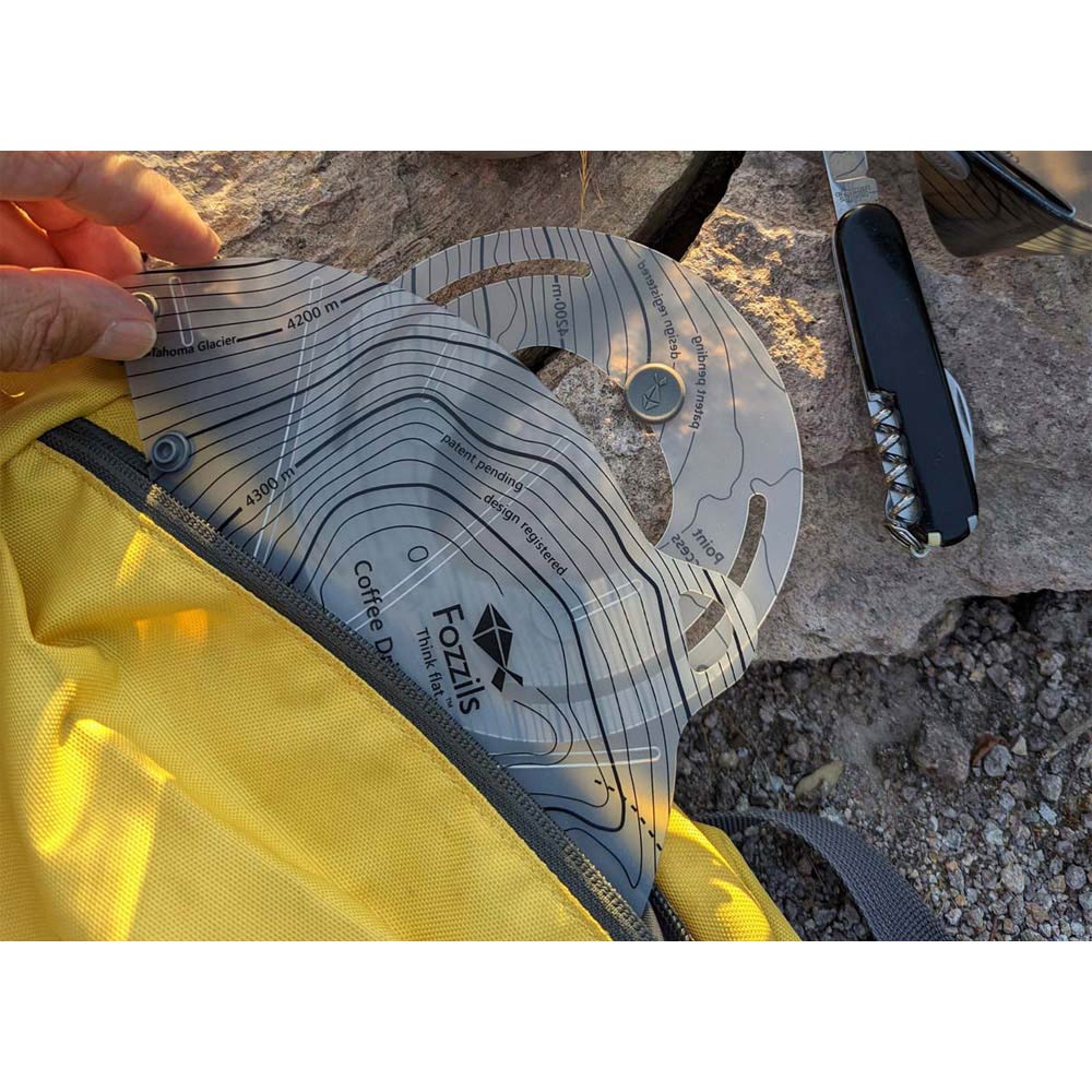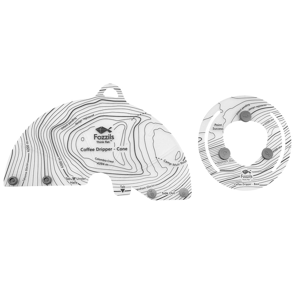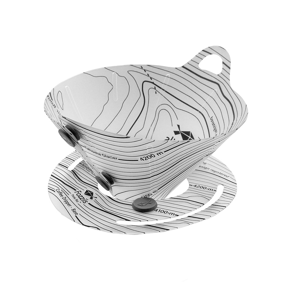 折り畳み式の円錐型コーヒードリッパーです。2ヶ所のスナップを留めるだけで簡単に組み立てられて、収納時は2枚のフラットなパーツになり、軽量で持ち運びに便利です。コーヒーを入れた後の処理がしやすい大きな持ち手がついています。大きいベースプレートとベースに取り付けられたラバーパーツで安定性が高く、様々なサイズのカップに対応します。