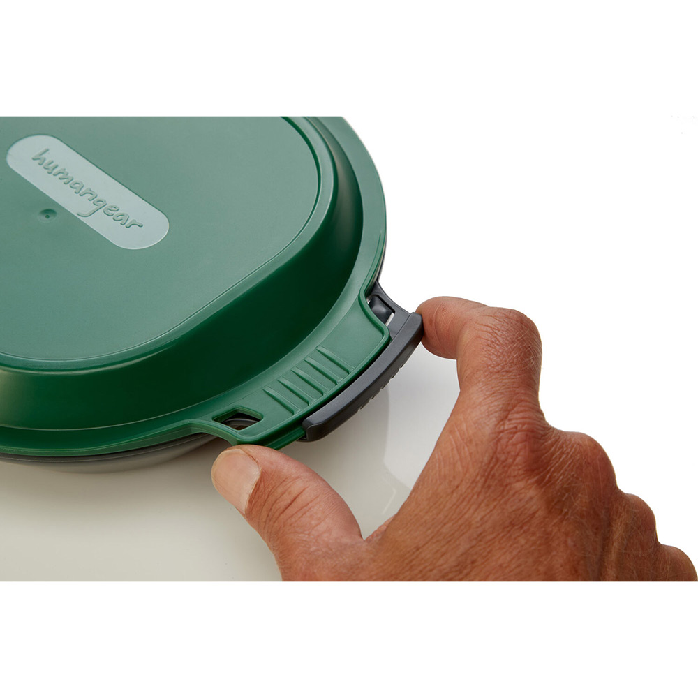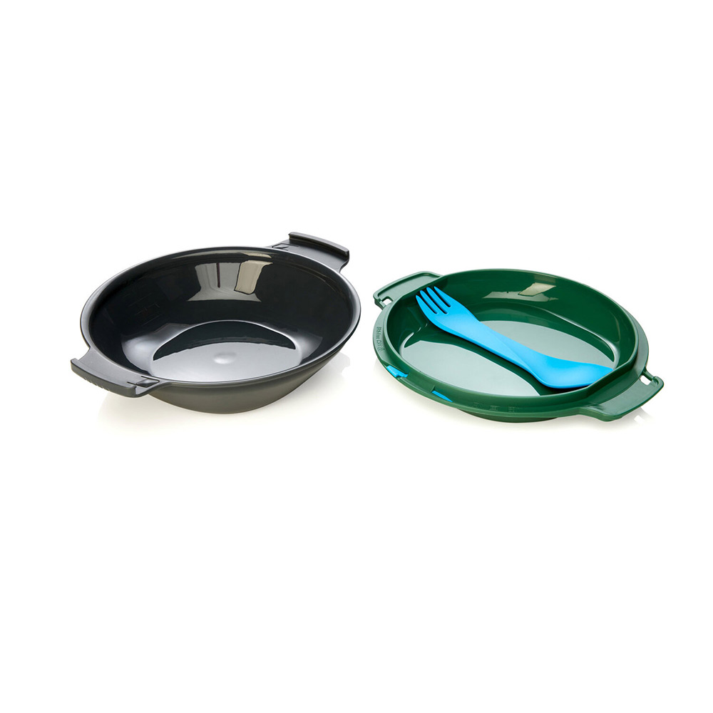 深皿と蓋、カトラリー、つまようじのセットです。深皿はカトラリーですくいやすいデザインになっており、底は持った時に熱が伝わりにくい波状になっています。深皿と蓋は持ち手同士を固定することができ、付属カトラリーは蓋のふちに固定し収納することができます。蓋は浅めのお皿としても使用できます。