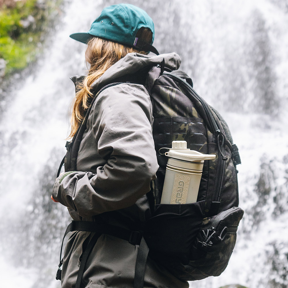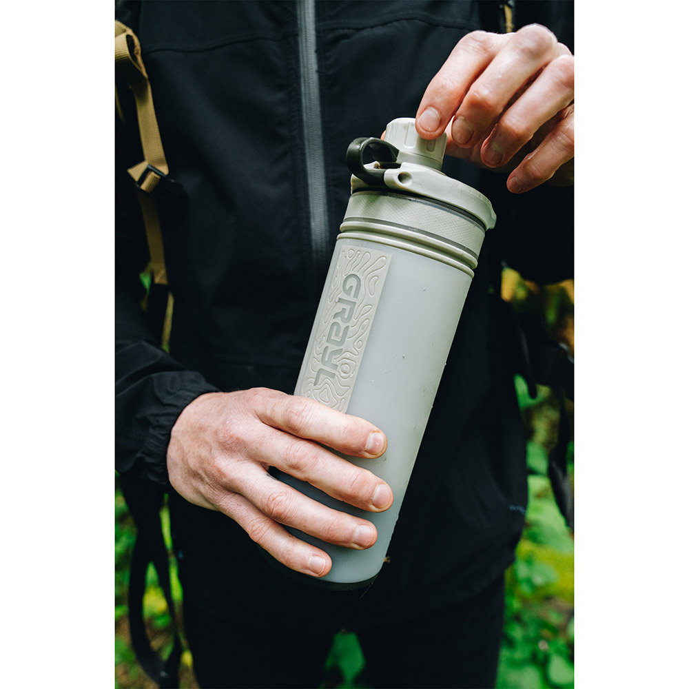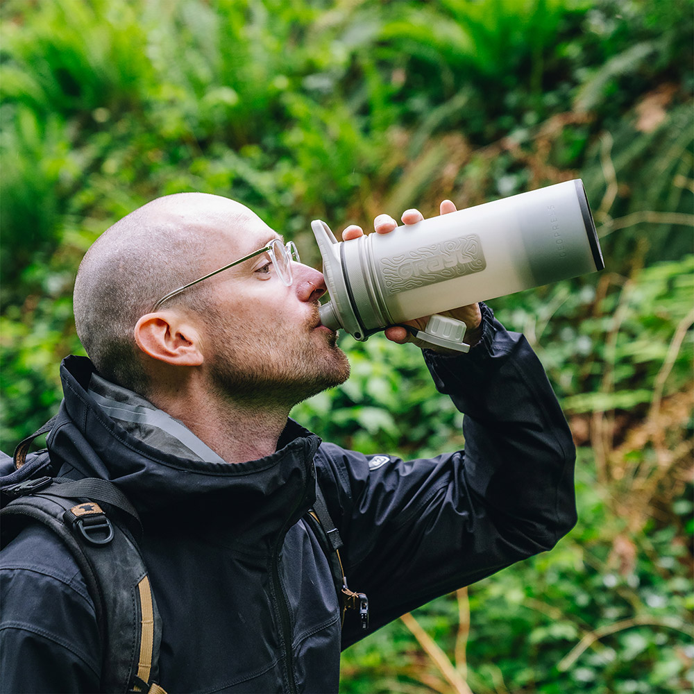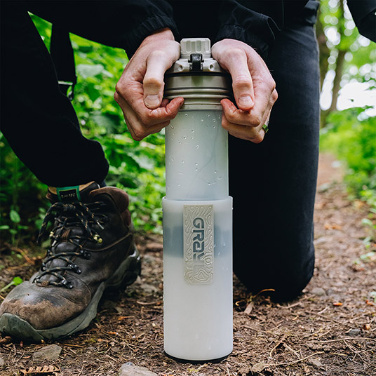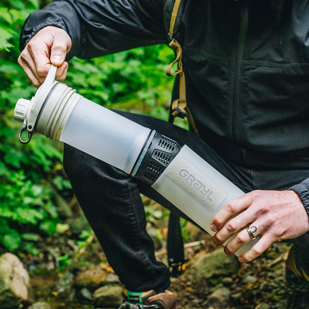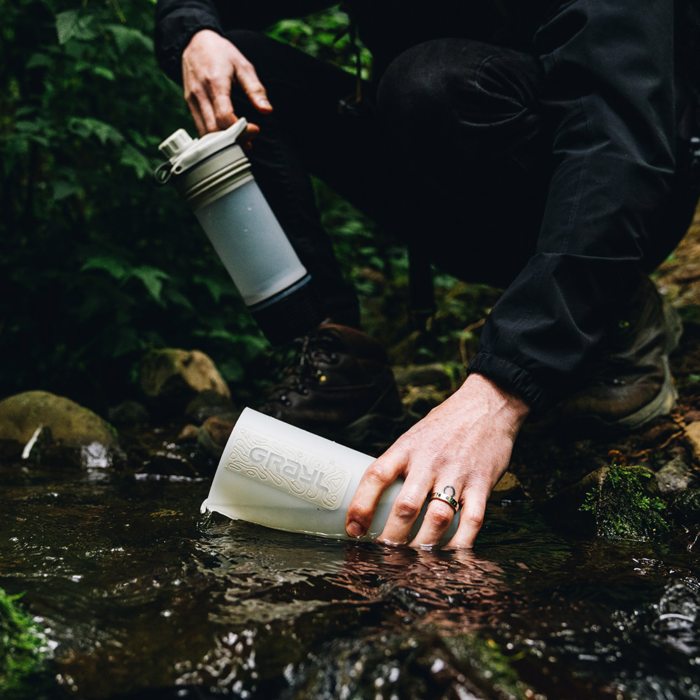 GRAYL独自の浄水・ろ過テクノロジーにより、わずか8秒で約710mLの水を浄化可能。フィルター内の電気吸着体や超粉末状活性炭が、細菌やエキノコックスなどの寄生虫はもちろん、通常のフィルターでは除去が難しいウイルスまで99.9%以上除去します(グレイル社提供データによる除去率)。浄化した水はそのまま飲用可能で、アウトドアをはじめ、海外旅行や災害時などさまざまなシーンで活用できます。インナーボトルをアウターボトルに押し込むだけで浄水できるため、ろ過速度を生かして短時間に多くの水を確保できるのも特長です。