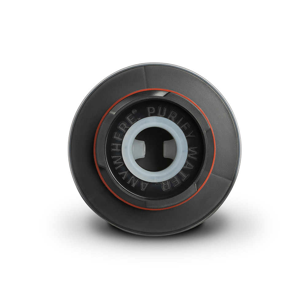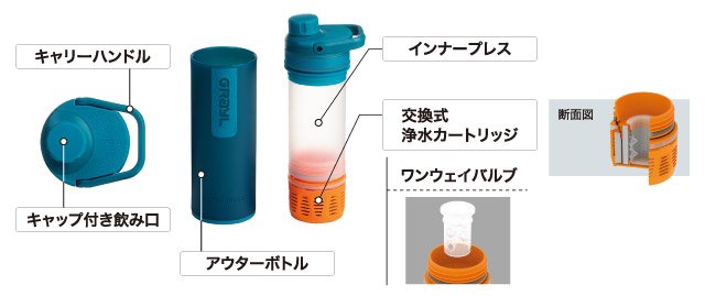 浄水カートリッジは繰り返し使用可能で、取り替えることもできます。逆流を防ぐ逆止弁付きバルブ(ワンウェイバルブ)を内蔵しているため、浄水した水が入ったボトルに粉末飲料などを溶かしたまま携行できます。