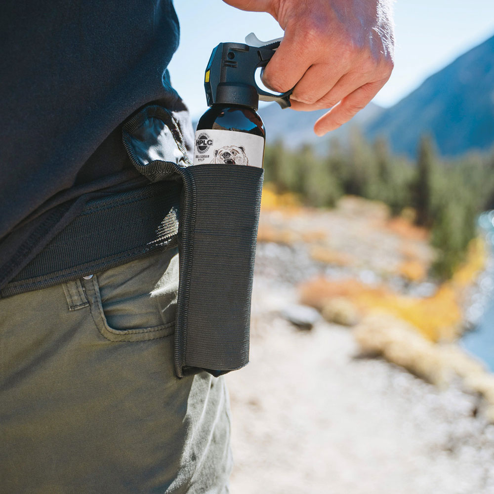万が一に備え、ベアスプレーを常に身に付け、利き手で取り出せる状態にしておくことが重要です。素早く対処するために、携行用のホルスターを胸の位置に装備したり、ベルトなどに通し、歩行の妨げにならない取り出しやすい腰回りに装備しておくのがおすすめです。
