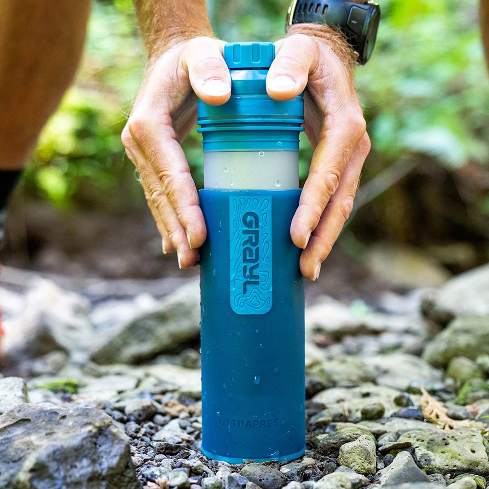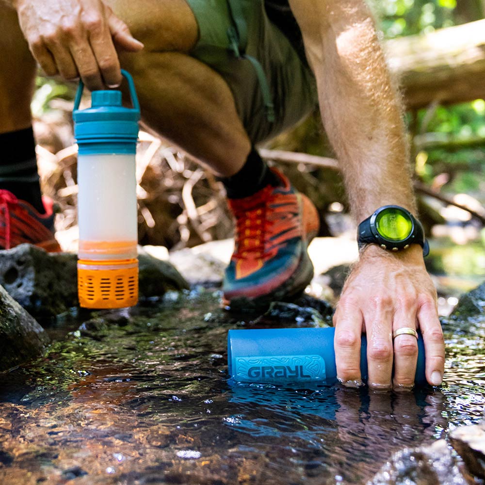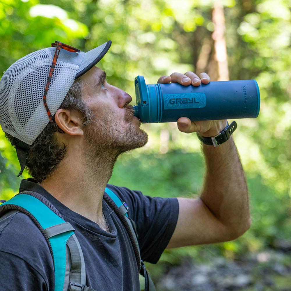 GRAYL独自の浄水・ろ過テクノロジーにより、わずか10秒で約500mLの水を浄化可能。フィルター内の電気吸着体や超粉末状活性炭が、細菌やエキノコックスなどの寄生虫はもちろん、通常のフィルターでは除去が難しいウイルスまで99.9%以上除去します(グレイル社提供データによる除去率)。浄化した水はそのまま飲用可能で、アウトドアをはじめ、海外旅行や災害時などさまざまなシーンで活用できます。インナーボトルをアウターボトルに押し込むだけで浄水できるため、ろ過速度を生かして短時間に多くの水を確保できるのも特長です。