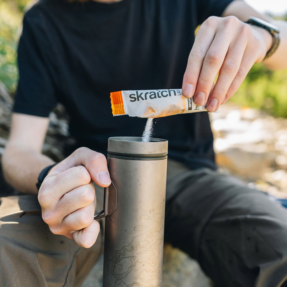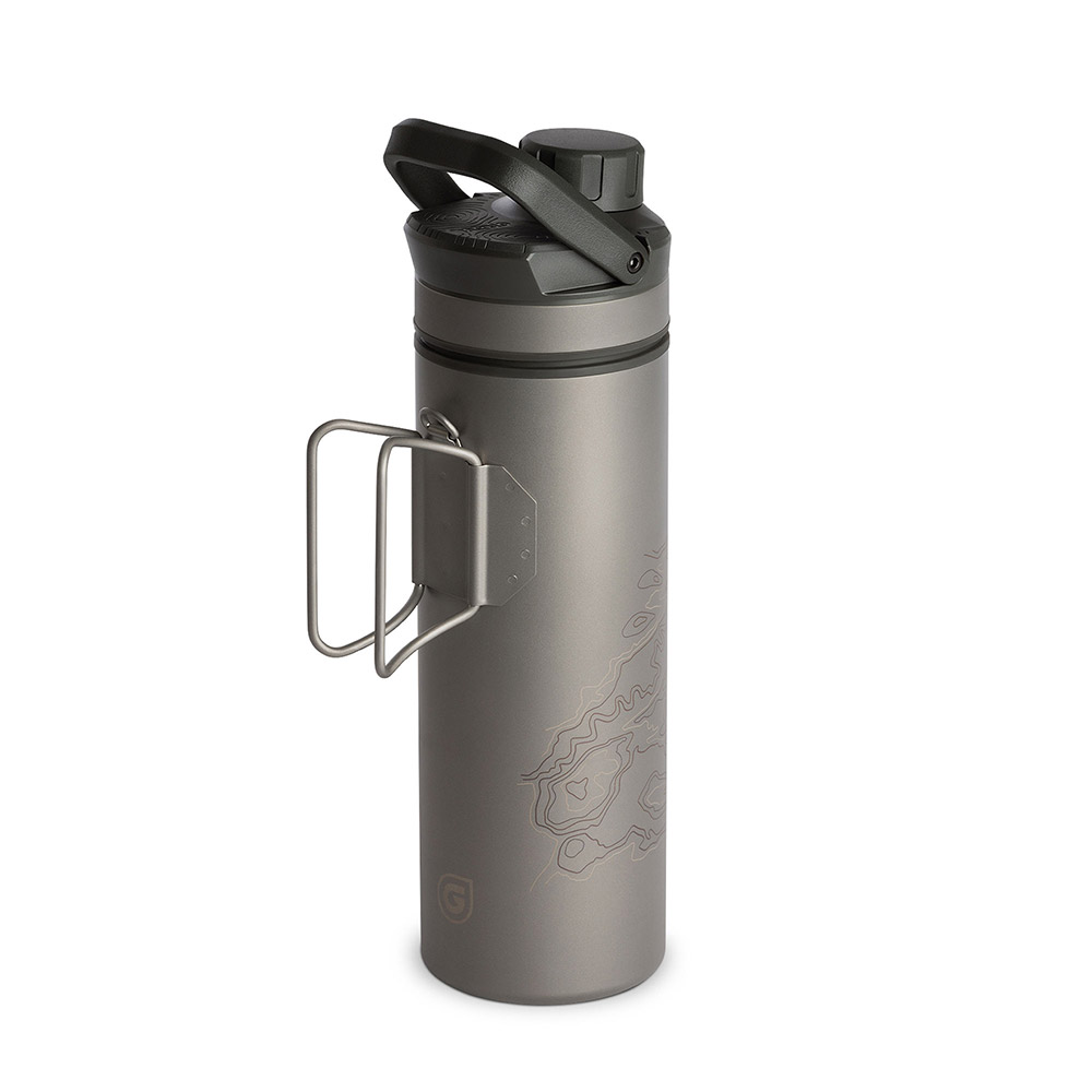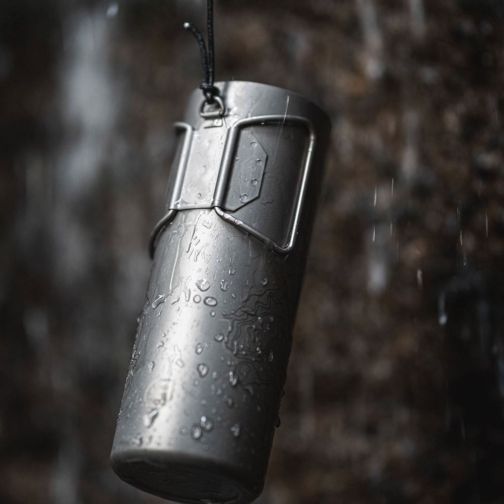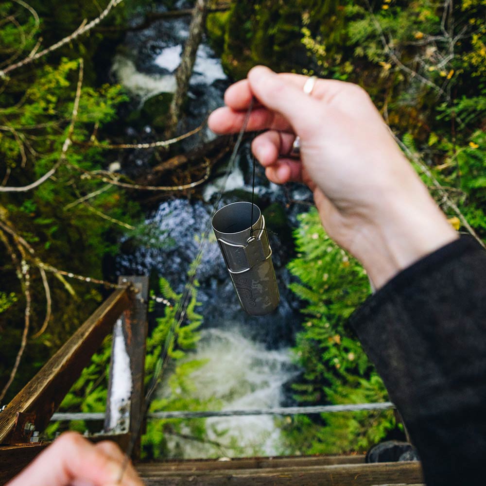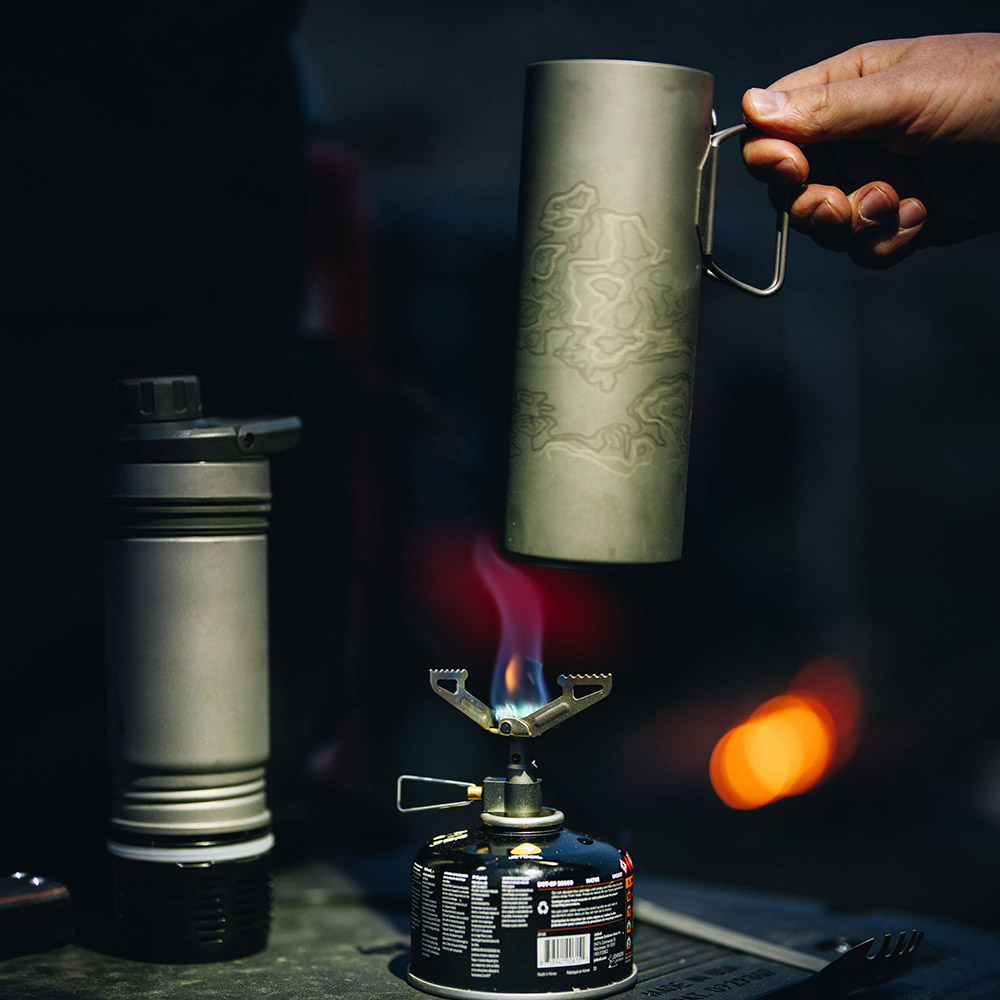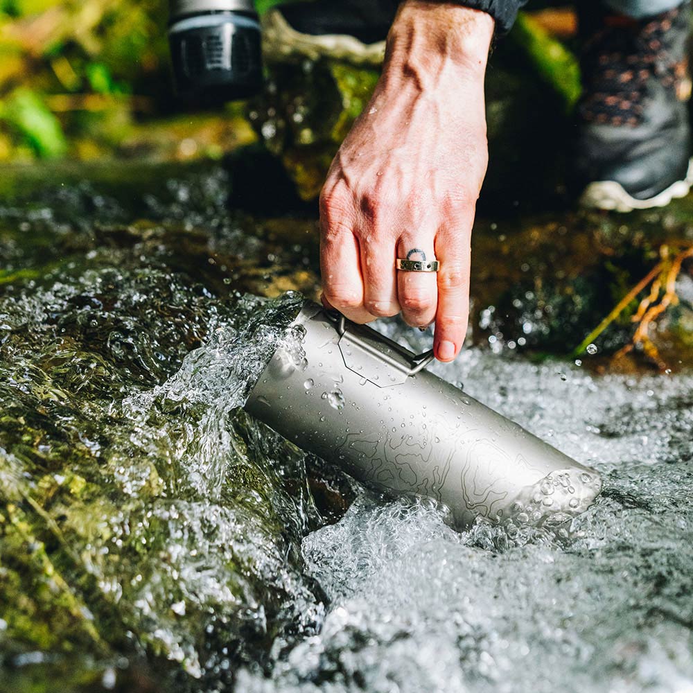 安全な飲料水を簡単に素早く確保できるプレス式浄水ボトル。チタン製で、耐久性、耐食性に優れ、アウターボトルは直火可能。厳しい環境にも耐えるタフ仕様。スリムで持ちやすく、バックパックのポケットなどに入れて携行しやすい形状です。折りたたみできるバタフライハンドルとDカン付きで、Dカンにパラコードを通すことで、降りていけない水場にもアプローチできます。