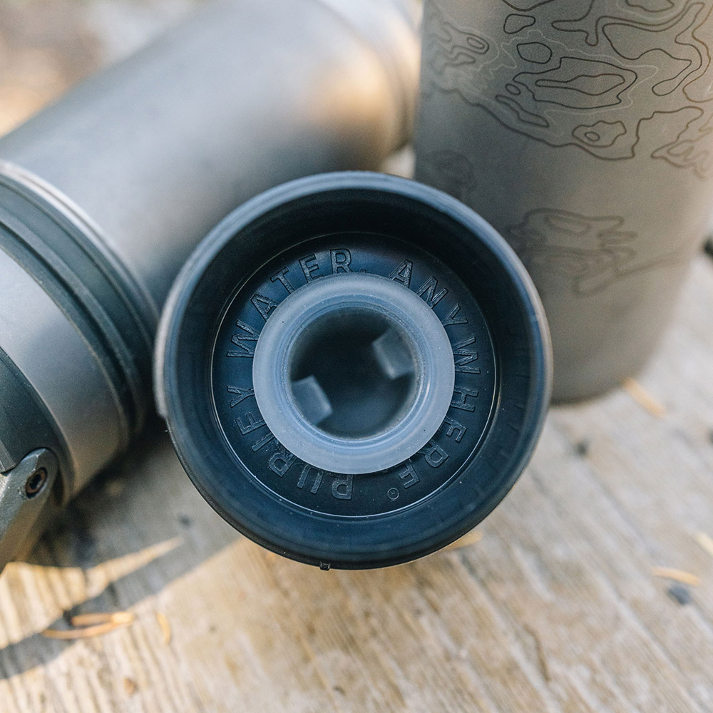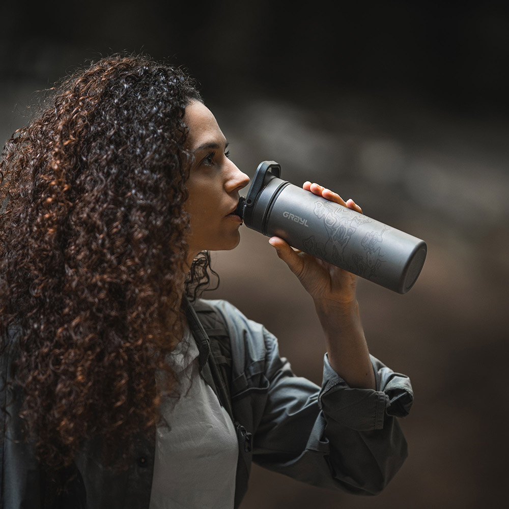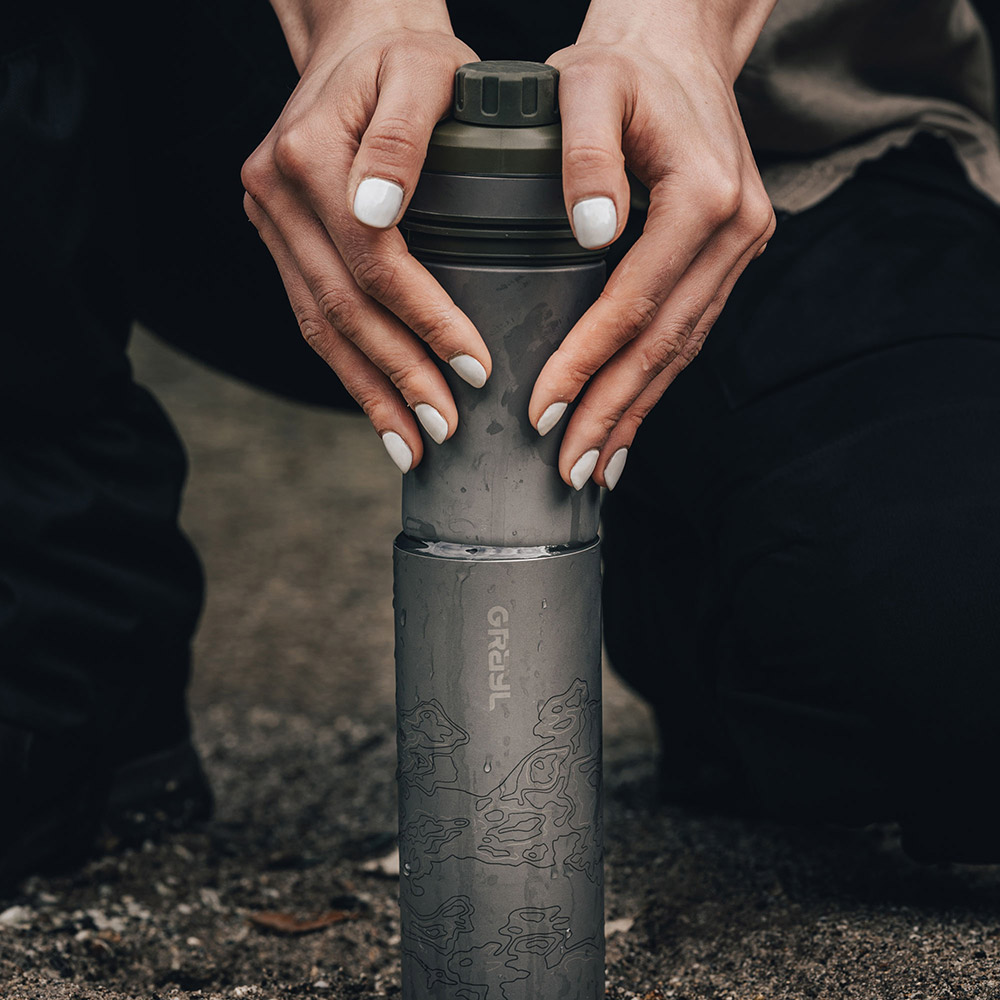 GRAYL独自の浄水・ろ過テクノロジーにより、わずか10秒で約500mLの水を浄化可能。フィルター内の電気吸着体や超粉末状活性炭が、細菌やエキノコックスなどの寄生虫はもちろん、通常のフィルターでは除去が難しいウイルスまで99.9%以上除去します(グレイル社提供データによる除去率)。浄化した水はそのまま飲用可能で、アウトドアをはじめ、海外旅行や災害時などさまざまなシーンで活用できます。インナーボトルをアウターボトルに押し込むだけで浄水できるため、ろ過速度を生かして短時間に多くの水を確保できるのも特長です。