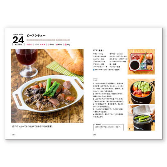 コンパクトで高性能なクッキングバーナー「JETBOIL®(ジェットボイル®)」で作る、アウトドア料理のレシピ集。サラダ、スープ、ごはんもの、煮込み料理、パスタ、エスニック、スイーツなど、幅広いジャンルの55レシピを、初心者にもわかりやすく解説。さらに、潮干狩りやタケノコ狩り、山菜採りなど、身近な自然の恵みを“採って、食べる”楽しさも紹介されていて、アウトドアに出かけたくなる一冊です。