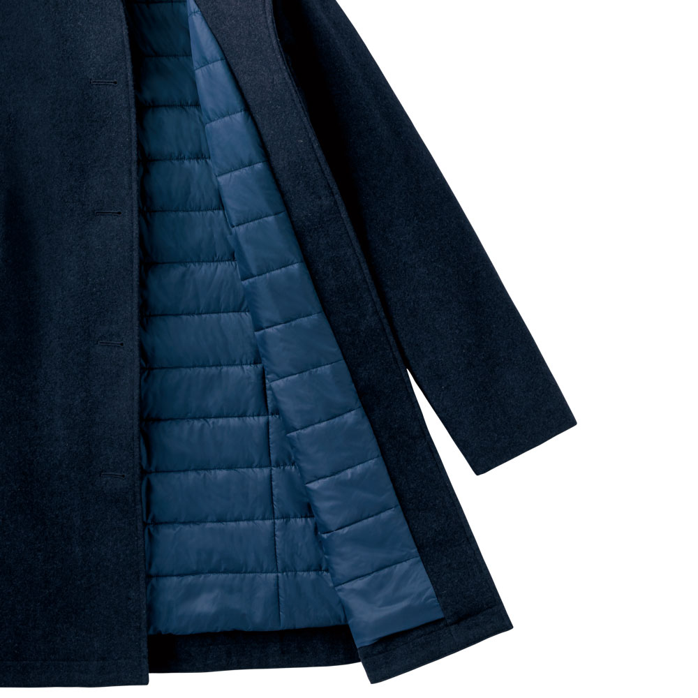 暖かく上質なウールを表地に使用した、旅行や普段の着用に最適な膝丈の中綿入りコートです。中綿にはお手入れが容易で保温性に優れたエクセロフト®を使用。裏地には滑りがよく、帯電防止加工を施した生地を使用しています。手洗いによる洗濯が可能です。※洗濯の際は中性洗剤をご使用ください。
