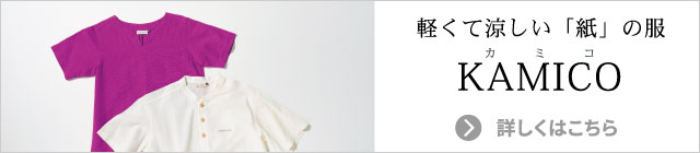 紙糸プラスはマニラ麻や針葉樹から取り出した原料で作った紙を細長く切り、撚り(より)をかけてできた紙糸に、異なる繊維をプラスして作る素材です。肌離れのよさと、優れた通気性・吸放湿性・軽量性という特長から、暑い時季でも清涼感のある快適な着心地を実現しています。