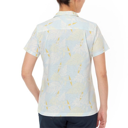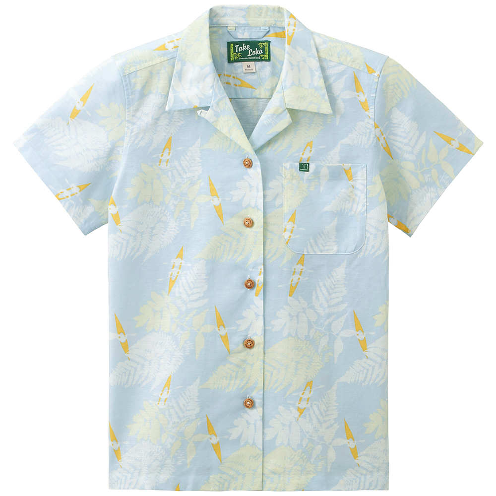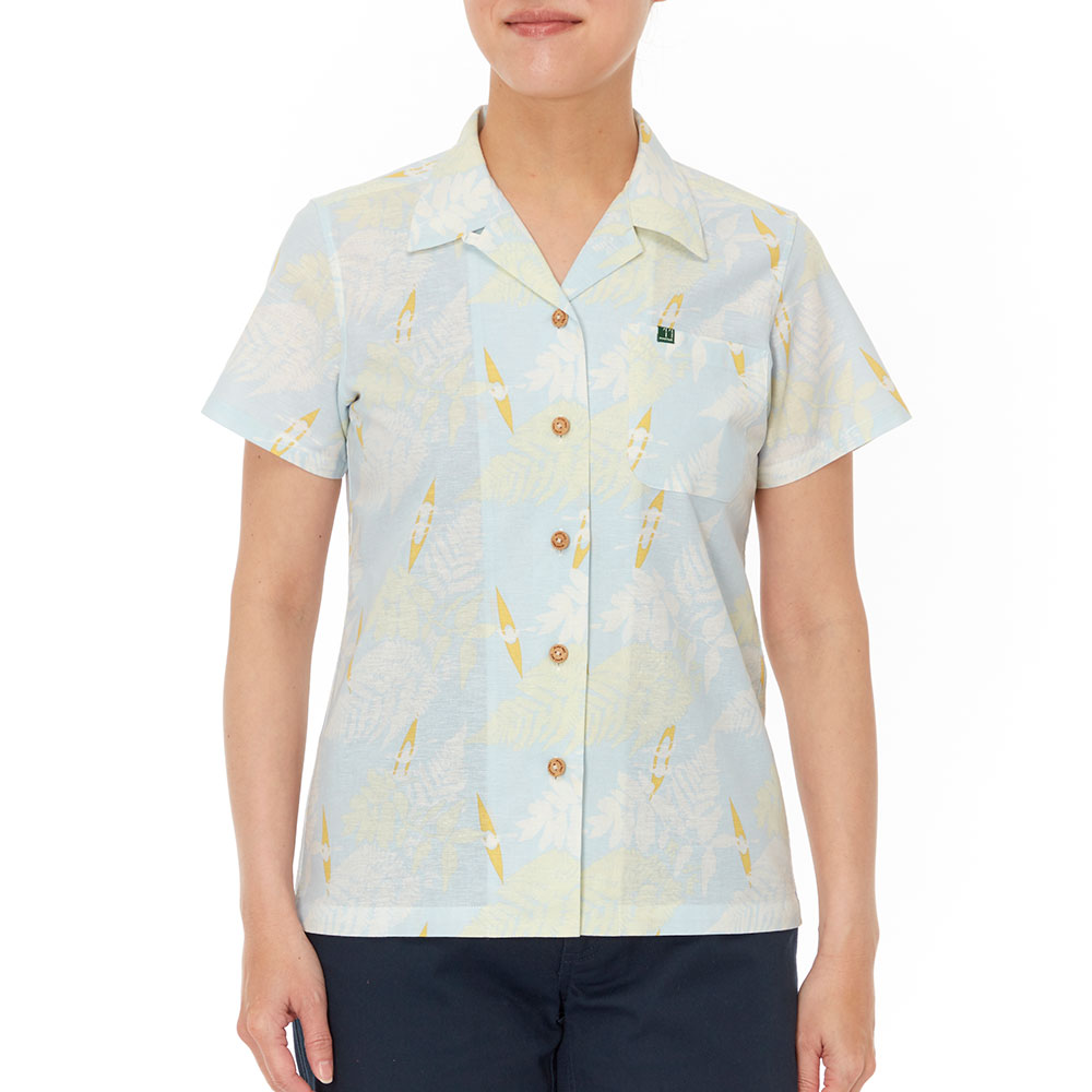 サラサラとした風合いで肌離れがよく、爽快な着心地のアロハシャツです。適度なハリを持つためシワになりにくく、トラベルシーンに最適。ナチュラルな表情で手触りもよい竹製ボタンを使用しています。カヤックをモチーフにしたデザインです。