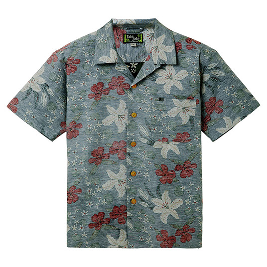 サラサラとした風合いで肌離れがよく、爽快な着心地のアロハシャツです。適度なハリを持つためシワになりにくく、トラベルシーンに最適。ナチュラルな表情で手触りもよい竹製ボタンを使用しています。山地の花をあしらったデザインです。プリント生地を裏使いしています。