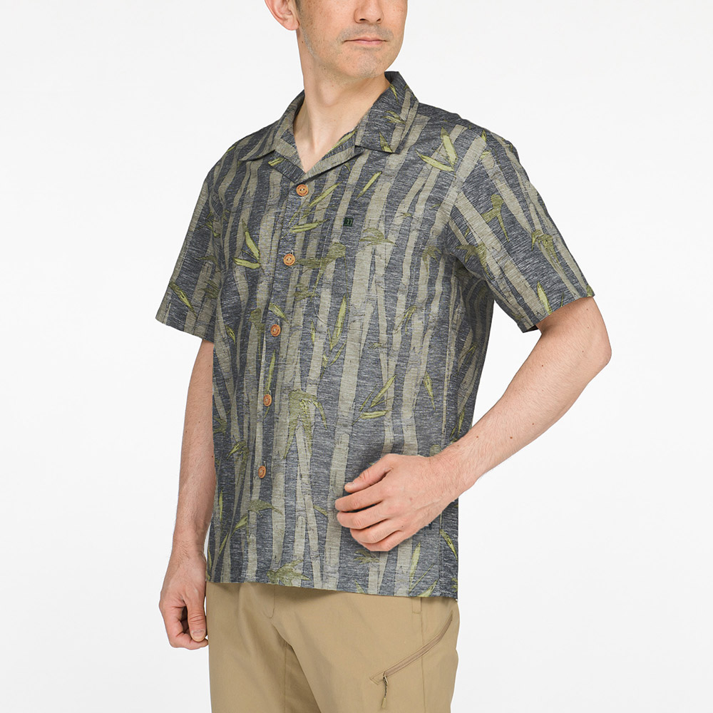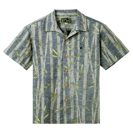 サラサラとした風合いで肌離れがよく、爽快な着心地のアロハシャツです。適度なハリを持つためシワになりにくく、トラベルシーンに適しています。ナチュラルな表情で手触りもよい竹製ボタンを使用しています。竹をあしらったデザインでプリント生地を裏使いしています。