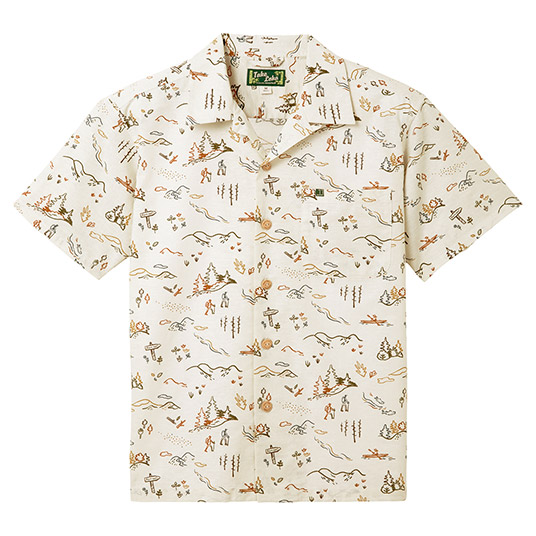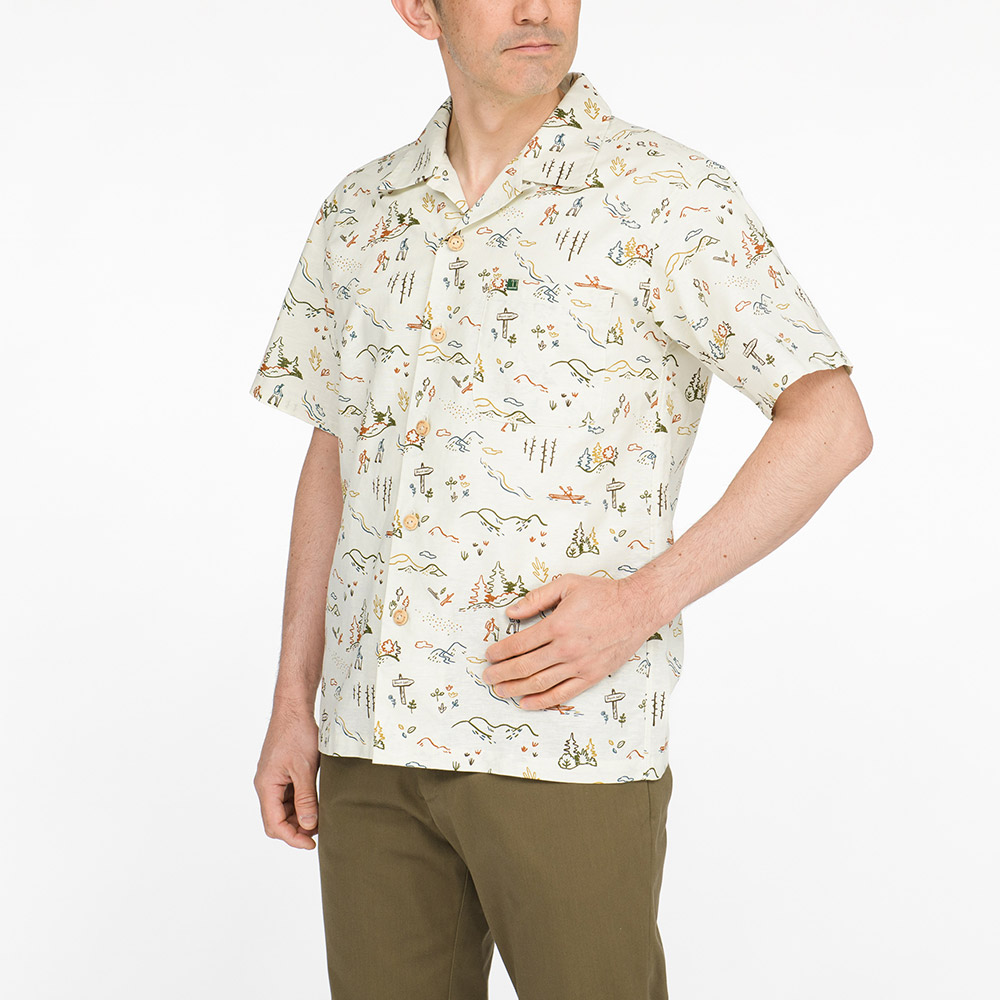 サラサラとした風合いで肌離れがよく、爽快な着心地のアロハシャツです。適度なハリを持つためシワになりにくく、トラベルシーンに適しています。ナチュラルな表情で手触りもよい竹製ボタンを使用しています。自然の中で登山などのアクティビティを楽しむ様子をモチーフにしたデザインです。