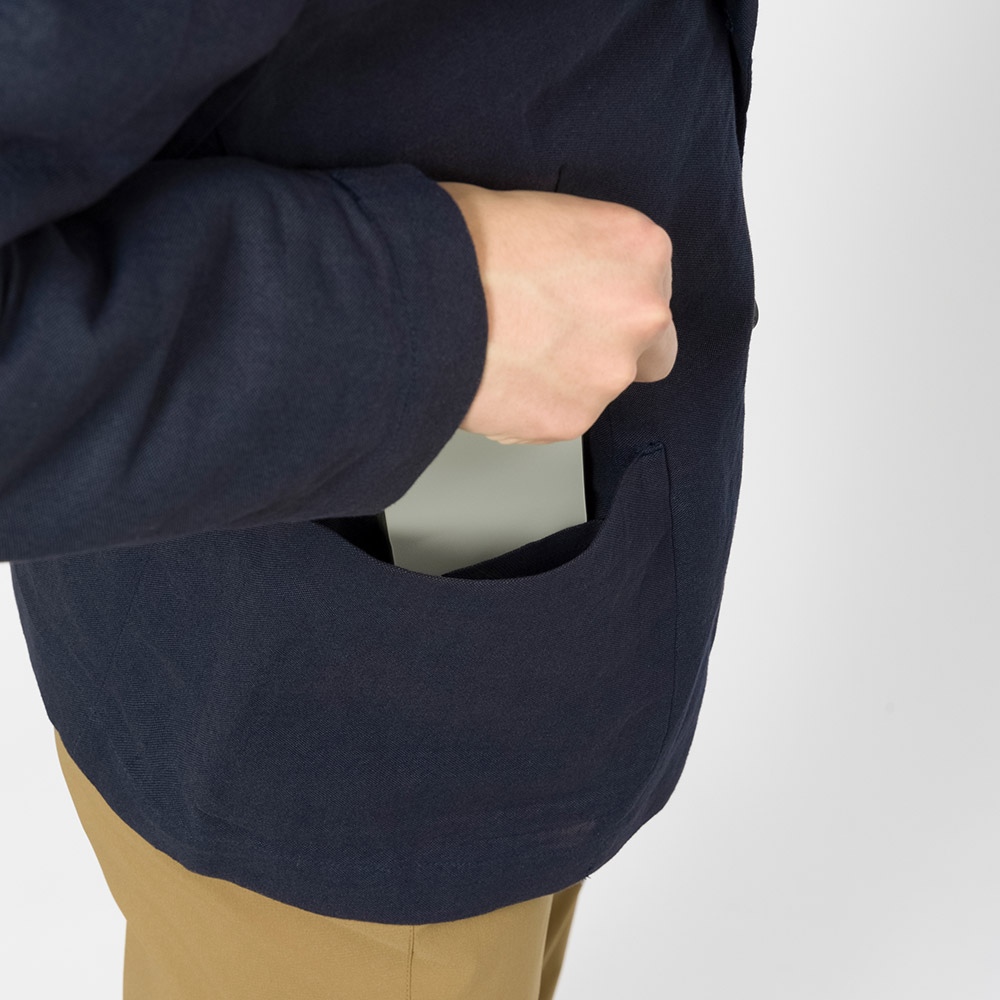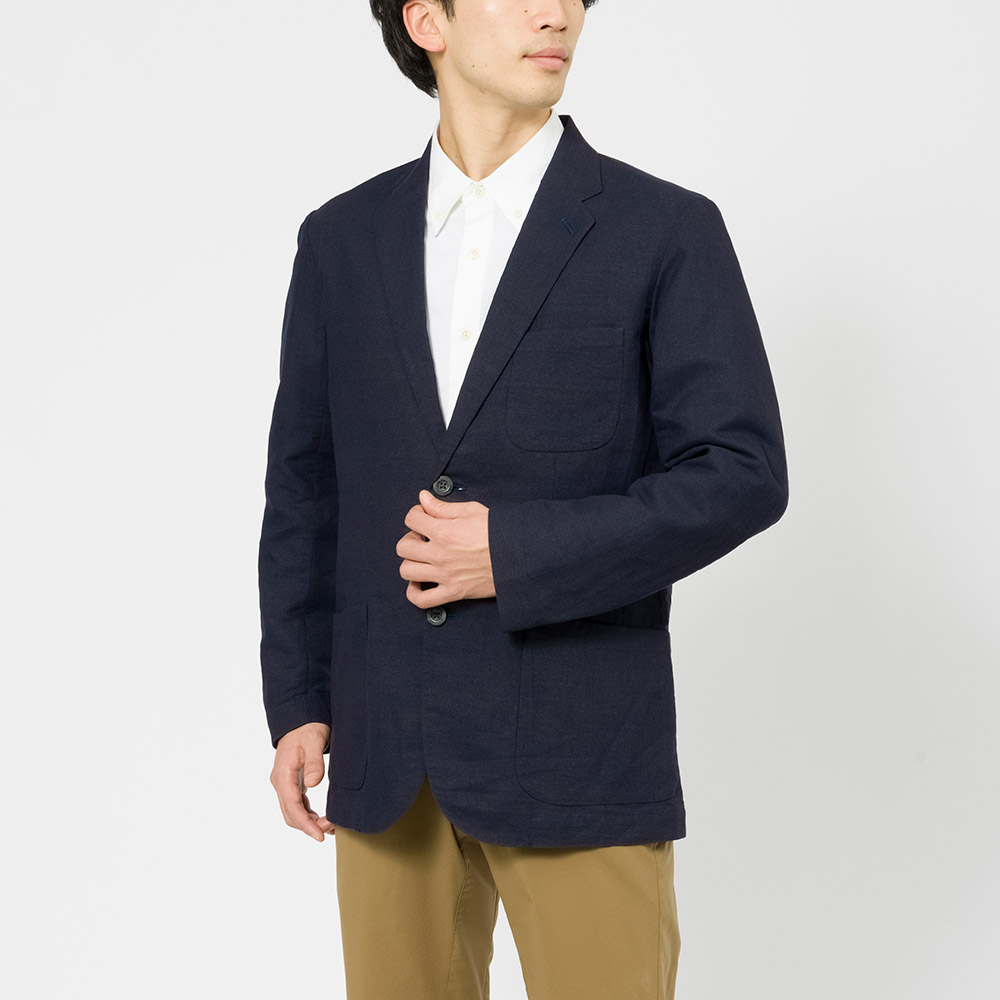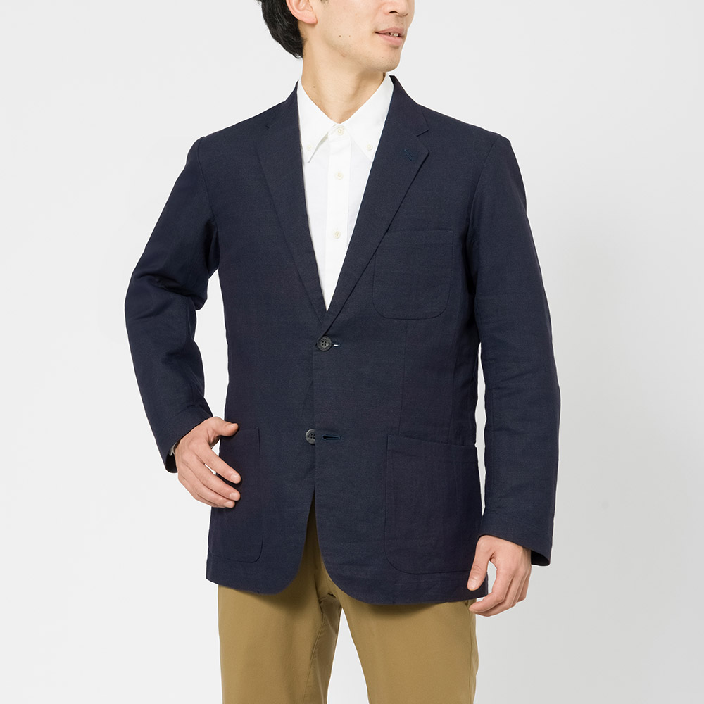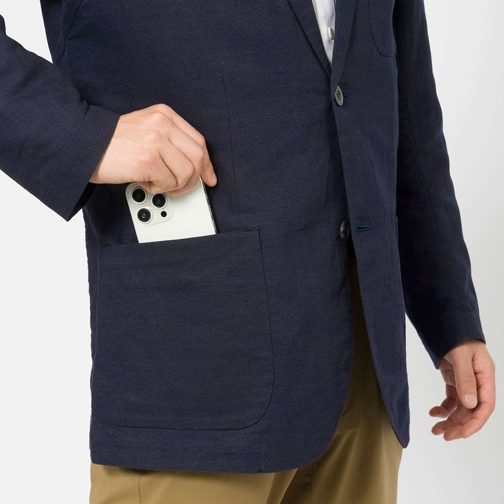 清涼素材・紙糸プラス®で仕立てた、スタンダードな2つボタンのジャケット。涼しく軽やかな着心地です。裏地、肩パッドのないデザイン。旅行に便利な収納ケースが付属します。