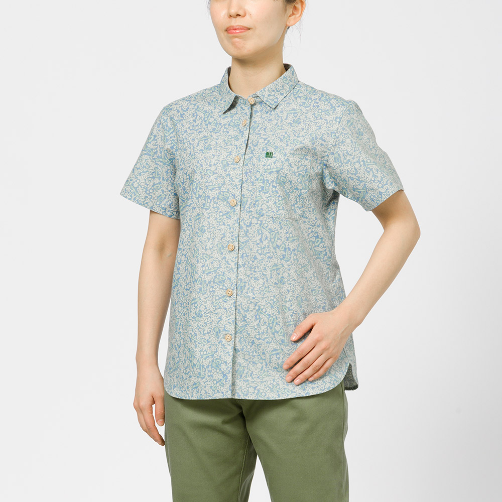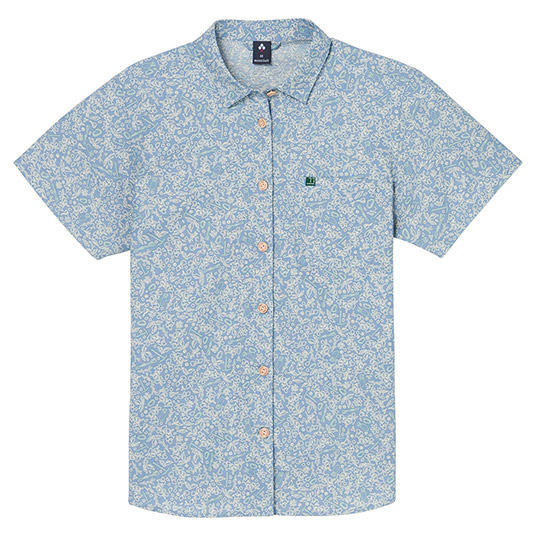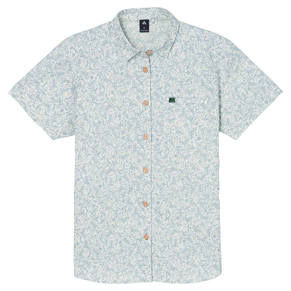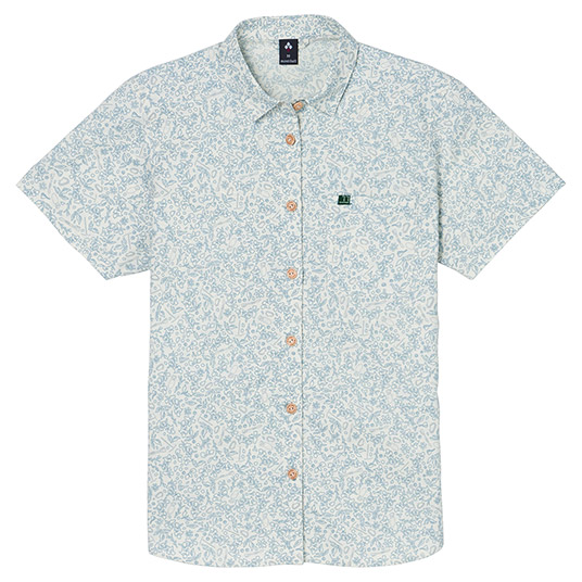 サラサラとした風合いで肌離れがよく、爽快な着心地のシャツです。適度なハリを持つためシワになりにくく、トラベルシーンに適しています。ナチュラルな表情で手触りもよい竹製ボタンを使用しています。草花やクライミングギアをモチーフにしたデザインです。