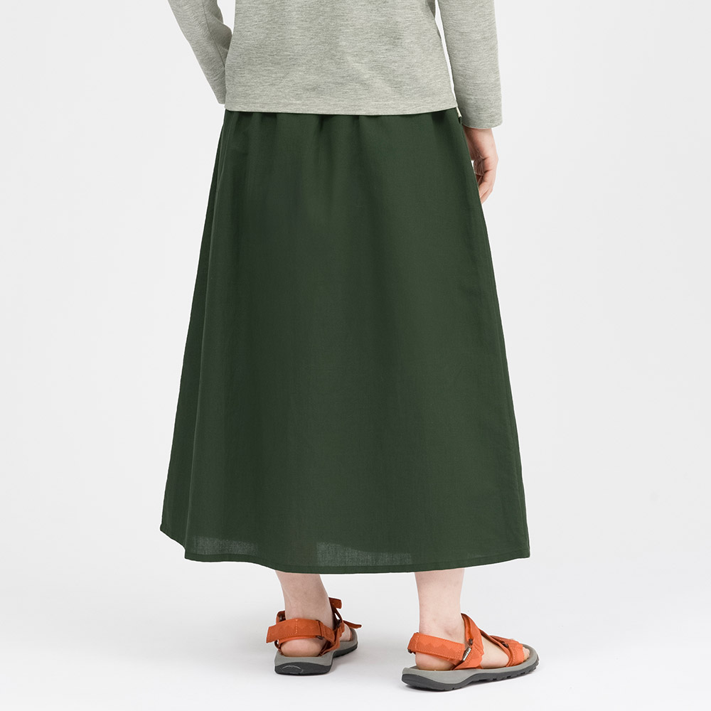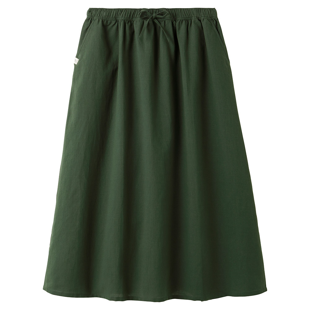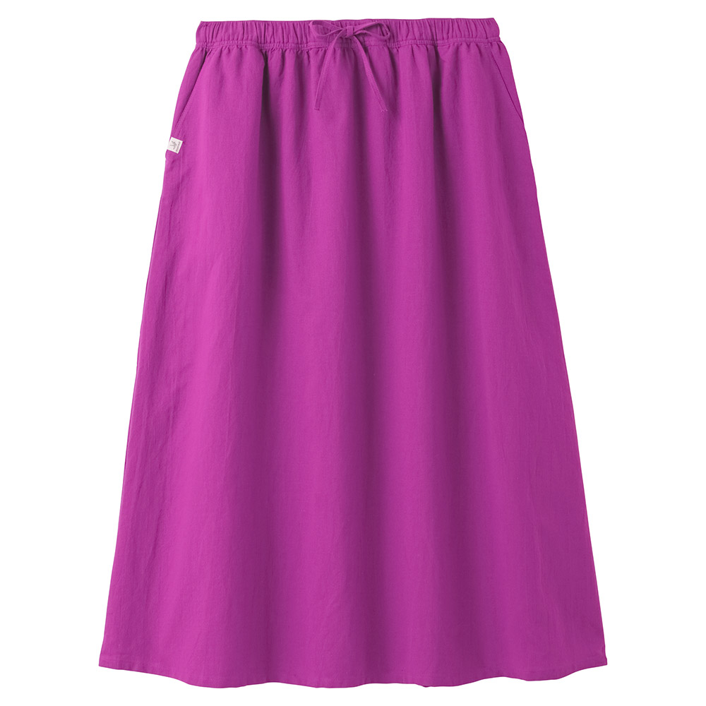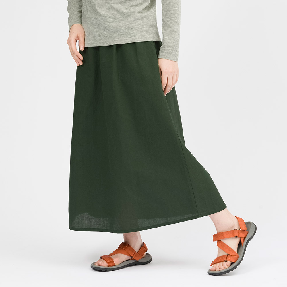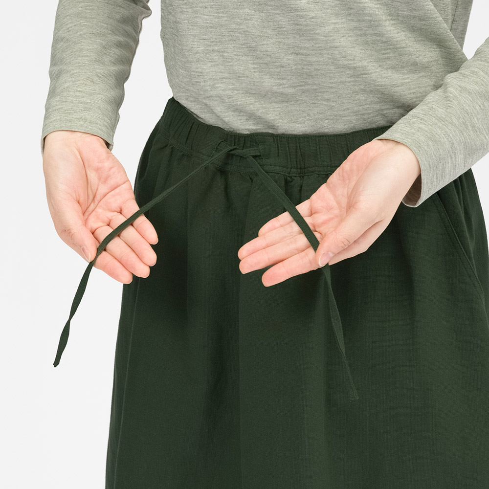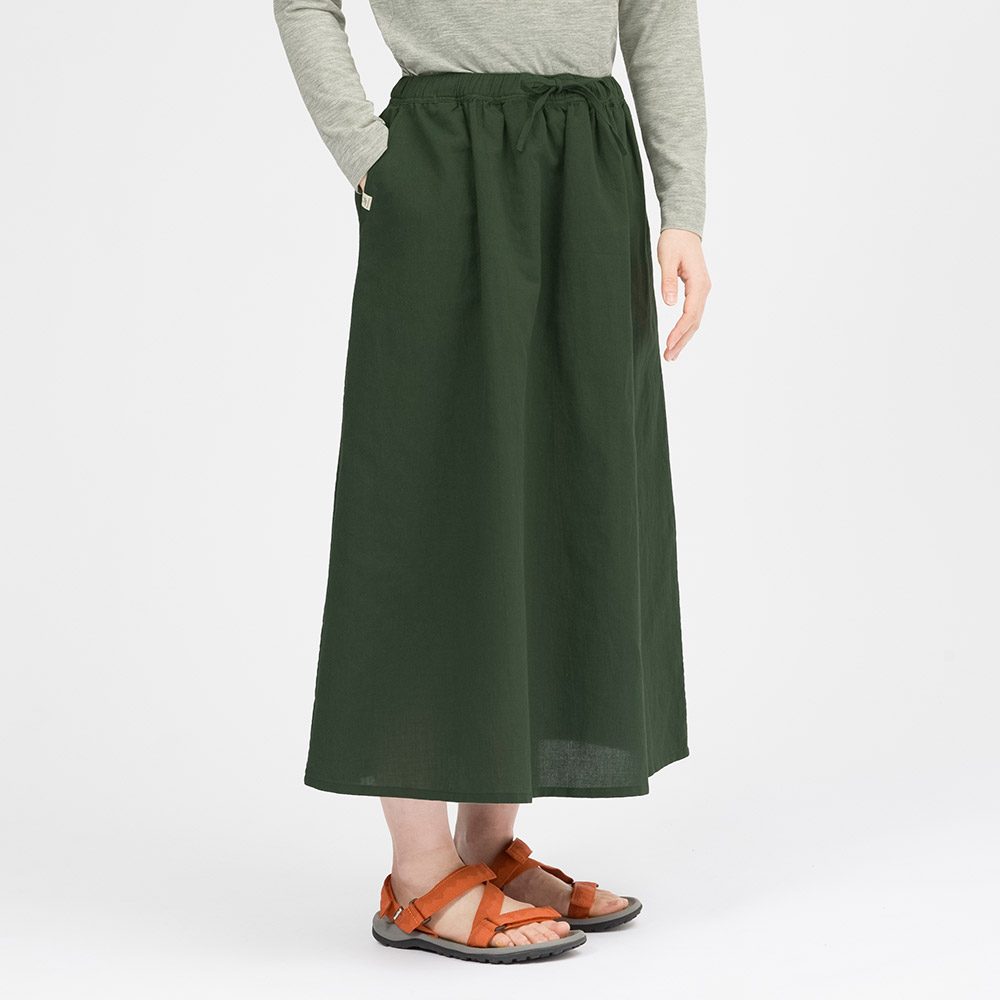 紙糸とコットンを組み合わせた清涼素材のスカートです。軽やかなはき心地で、旅先や日常でのリラックスウエアなどに適しています。