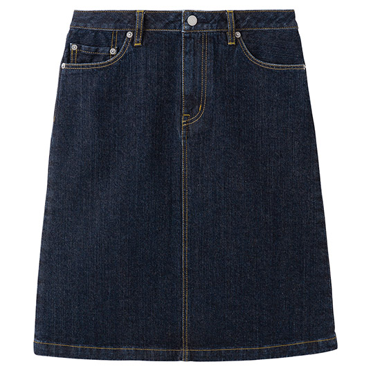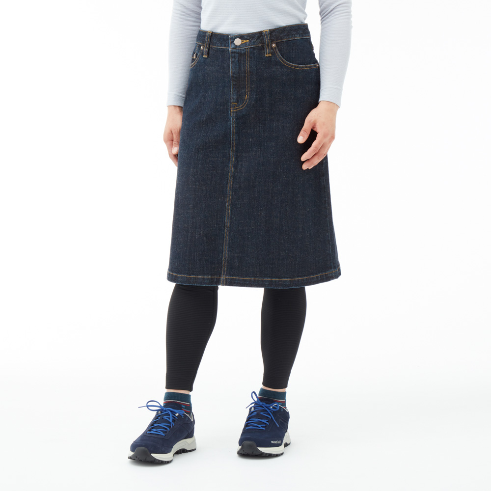 ストレッチ性のあるデニム生地を使用した膝丈のスカートです。動きやすく、旅行や普段使いで活躍します。洗い加工をかけることで、はき始めから肌になじみ、色落ちもしにくくなっています。