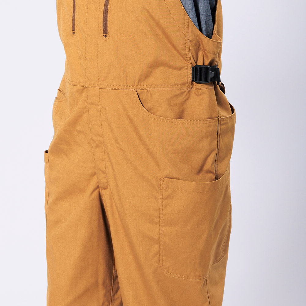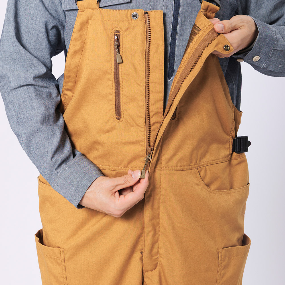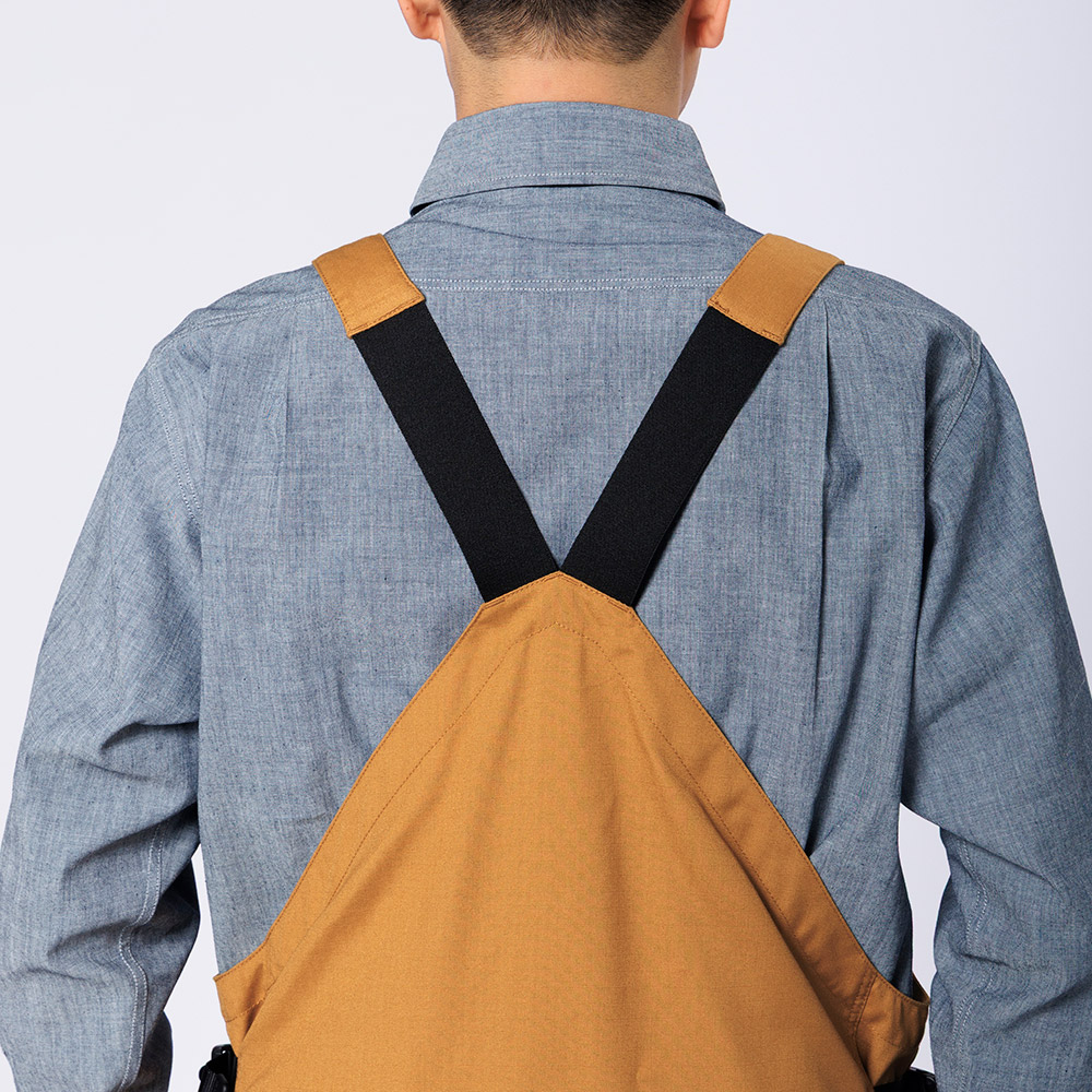 モンベルが独自に開発した難燃性素材フレアテクト®を使用したビブです。野外での調理やたき火などで火の粉を受けても、穴があきにくくなっています。道具や小物の収納に便利なポケットを多数備え、火を扱うシーンだけでなく、作業着としての着用にも適しています。ショルダーベルトは背面側にゴムを配置することで、しゃがんだ体勢でも突っ張りにくくなっています。 ※火から完全に身を守るものではありません。
