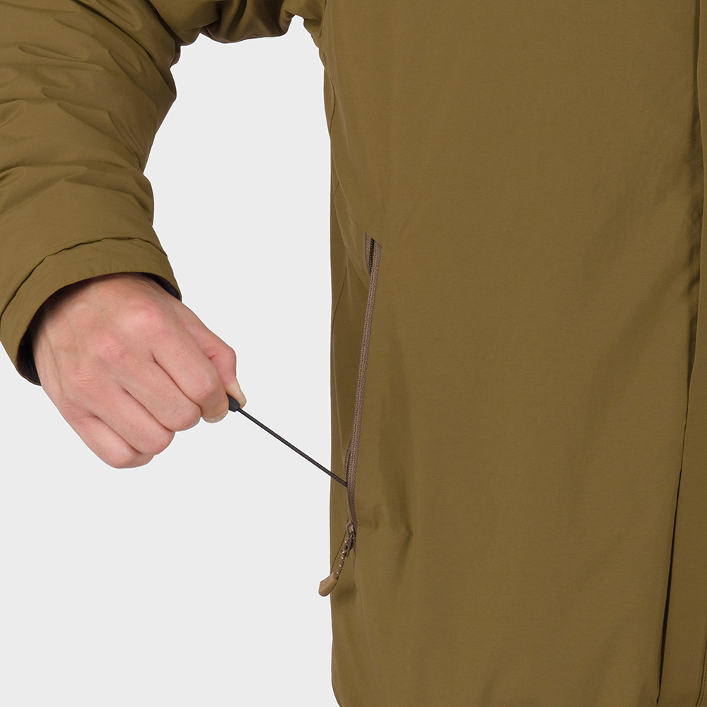 【特長】リバーシブル / 三枚差し構造 / ダウンプルーフ加工 / デュアルアクスルフード(片側のみ) / ジッパーがあごに当たらない仕様 / リードインコード・システム(裾)【ポケット】6個(表面:ジッパー付き〈腰2、胸1〉、裏面:ジッパー付き〈腰2、胸1〉)