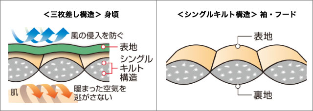 シングルキルト構造やボックス構造の中綿入りウエアに、表地をもう1枚加えることで冷気の侵入を防ぎ、暖まった空気を逃がしません。