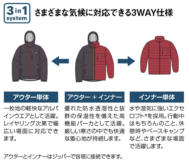 単体でも使用できるインナーを備え、季節や気温の変化に応じて3通りの使い方ができる汎用性の高いスノースポーツ用パーカです。アウターを単体で使用する場合は、ストレッチ性と透湿性を備えた軽快な一枚地のアルパインパーカとして活躍。インナーには汗や湿気に濡れても高い保温力と速乾性を発揮する、エクセロフト®を封入しています。【こちらは海外販売モデルのため、日本サイズと異なります。ご購入の際は必ずサイズ表をお確かめください。】