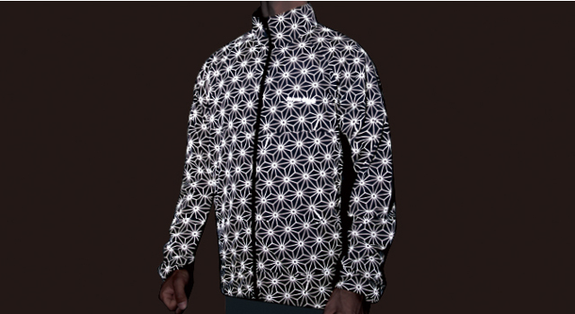 生地全体にプリントされたリクレックインクには、反射鏡となるアルミをコーティングした無数のガラスビーズが含まれています。
