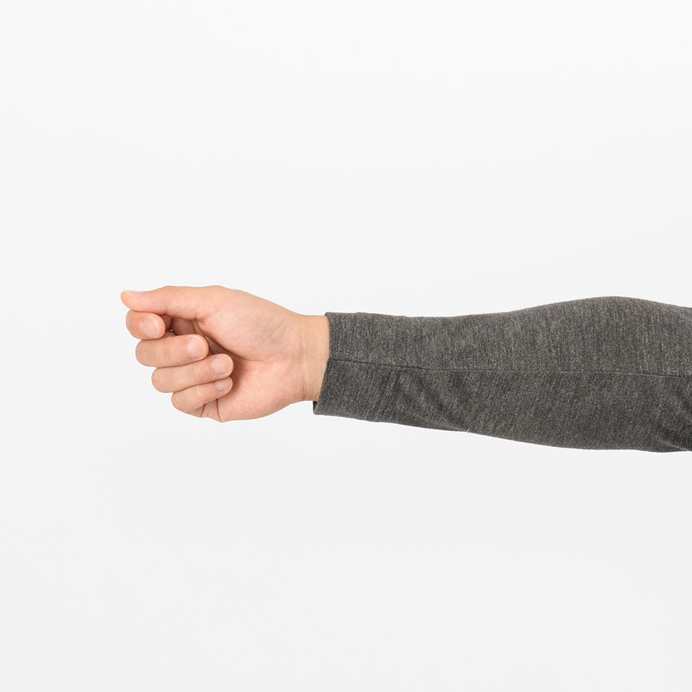 袖口の縫い目を斜め(スパイラル状)にすることでよく伸び、肌あたりの悪さや不快な締め付け感のない快適な着心地を実現しています。