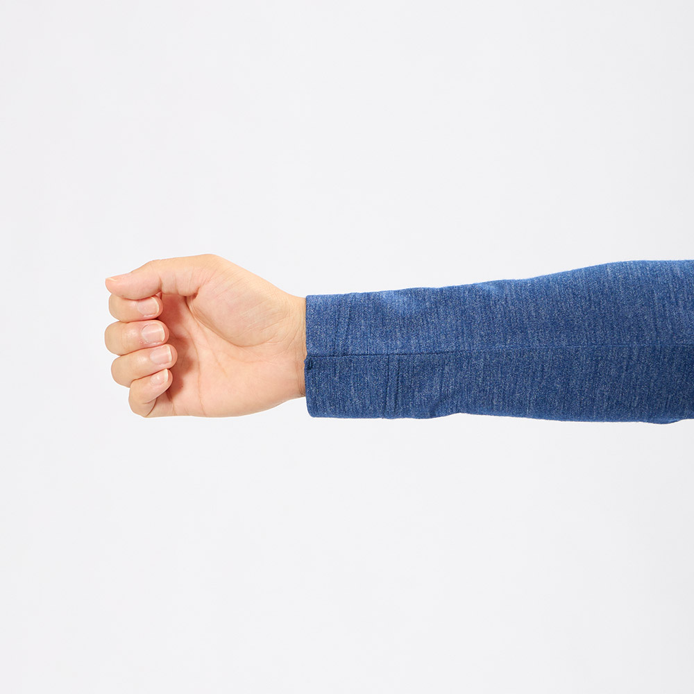袖口の縫い目を斜め(スパイラル状)にすることでよく伸び、肌あたりの悪さや不快な締め付け感のない快適な着心地を実現しています。