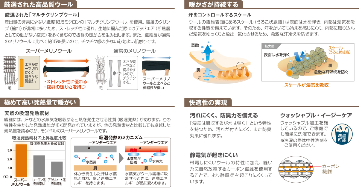 卓越した発熱量を誇るスーパーメリノウールに速乾性をプラスした、モンベル独自のアンダーウェアです。暖かい空気を保持するボックスコンストラクションを採用し、身体を包み込むような暖かさが持続します。【こちらは海外販売モデルのため、日本サイズと異なります。ご購入の際は必ずサイズ表をお確かめください。】