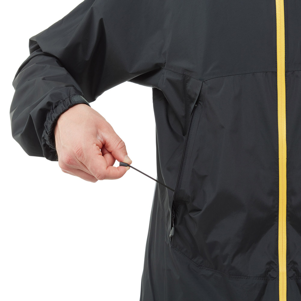本製品は全ての縫い目を目止め(シームテープ)処理することで身体側に水が浸入しないように設計されていますが、構造上ポケットは目止め出来ません。そのため、本製品のポケットは完全防水ではありません。貴重品等は防水ケースに入れるなどして、防水対策をしてください。