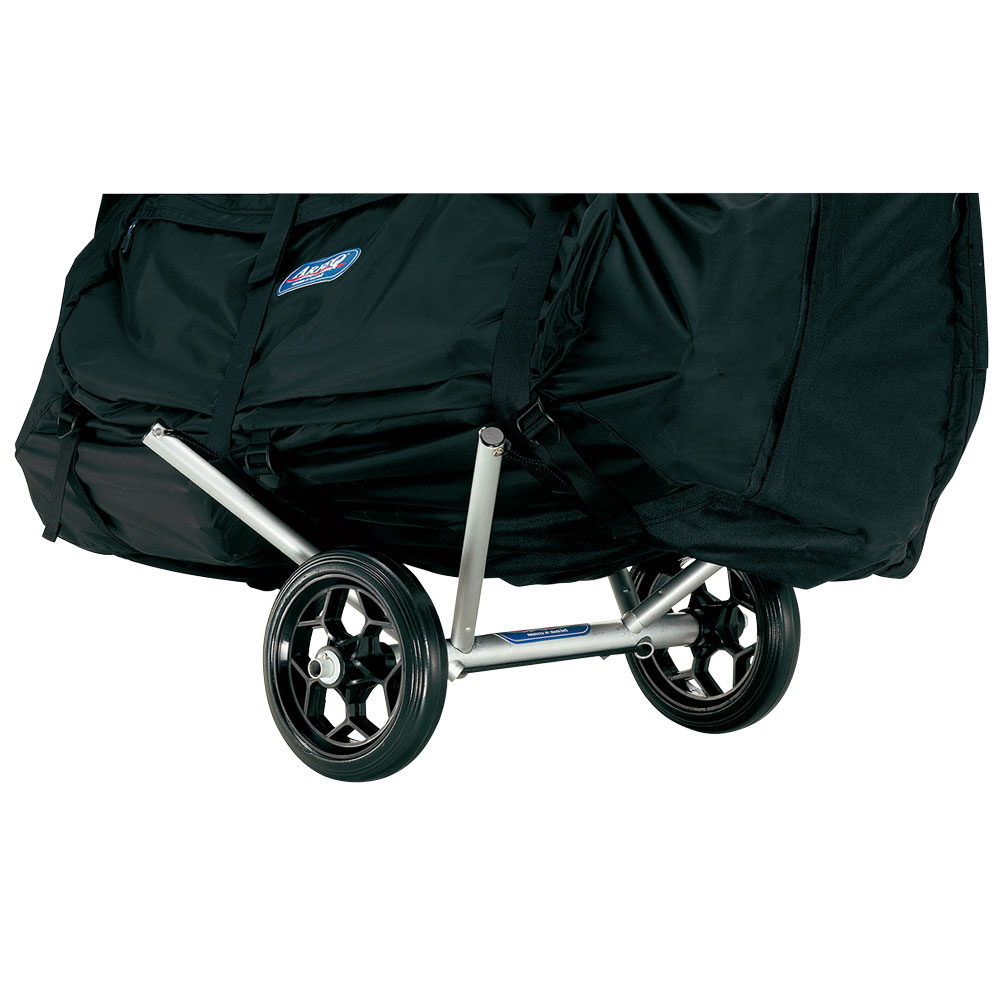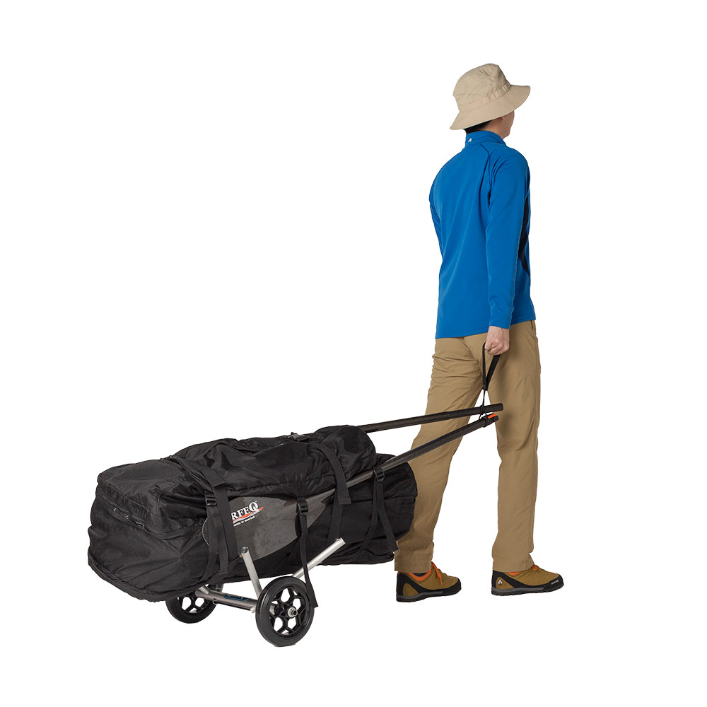 フォールディング・カヤックを楽に運搬できる折り畳み式のカートです。各ジョイント部分はゴムのショックコードでつなげてあるため、組み立て・分解が簡単。カヤックは組立てた状態でも、パッキングした状態でも運ぶことが可能です。直径20cmの大径車輪で、路面の多少の凹凸は気になりません。