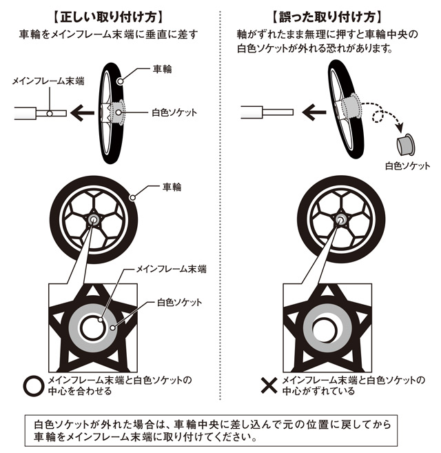 車輪をメインフレーム末端に取り付ける際は、フレームと車輪の中心を合わせてから垂直に押し込んでください。軸がずれたまま押し込むと、車輪中央の白色ソケットにメインフレーム末端が引っ掛かり、白色ソケットがはずれることがあります。
