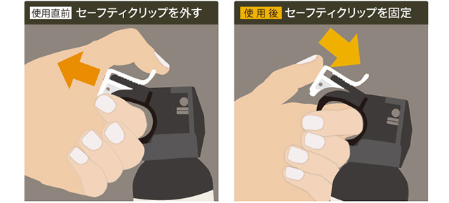 使用後:セーフティクリップを「カチッ」と音がするまで押し込み、外れないよう固定し、誤噴射を防ぎます。