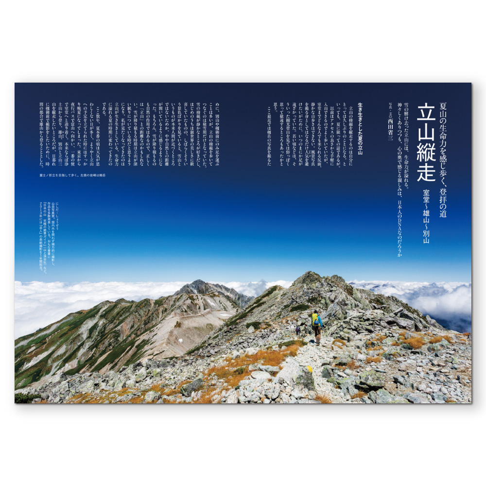 時代を超えて伝えたい山の魅力―。ひとたびページをめくると、先鋭的な現役クライマーにとっても、散策を楽しむハイカーや登山愛好者、さらに一線を退いた往年の登山家まで、想像力と冒険心をかきたてる、そんな存在でありたい。