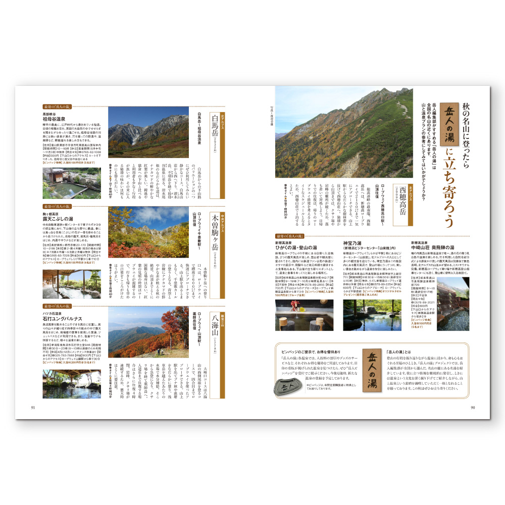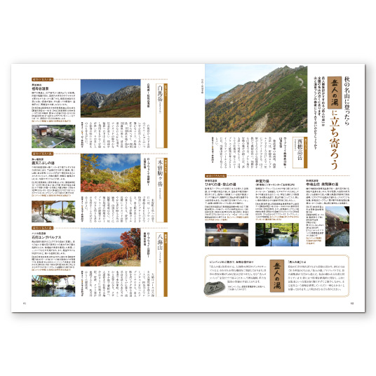 秋はアルプスはもちろん、身近な低山でも過ごしやすく、あらゆる場所で快適な登山が楽しめます。「紅葉と温泉」をテーマに、北海道から九州まで全国の一度は行きたい名山を紹介。温泉や食事処など、下山後のお楽しみ情報も満載です。