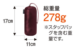 【特長】シングルキルト構造/ダウンプルーフ加工/ジッパーがあごに当たらない仕様/ジッパー付きポケット2個(腰2)/スタッフバッグ付き