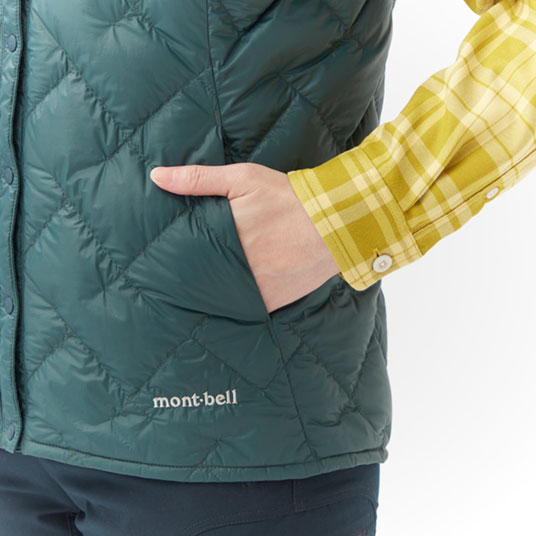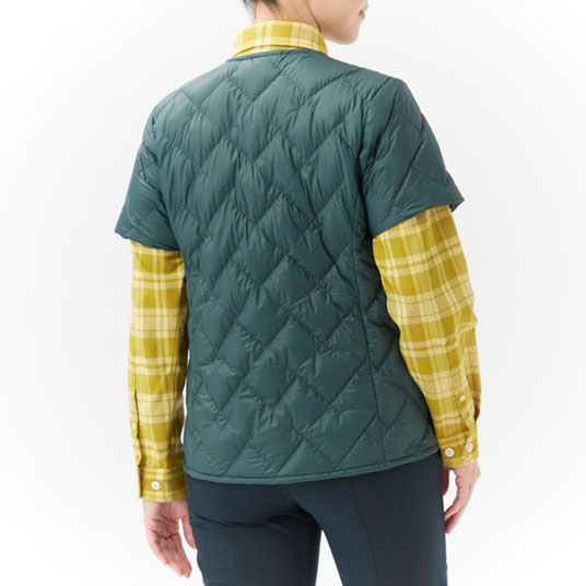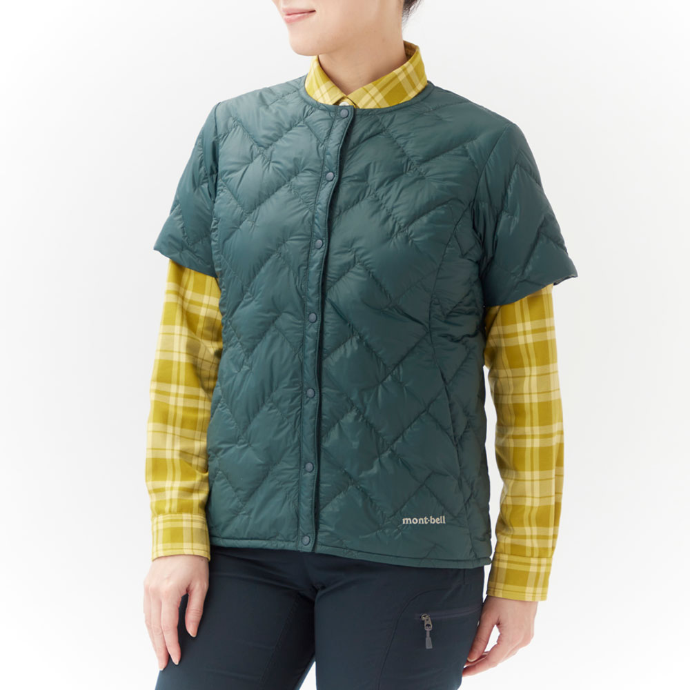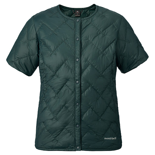 高品質な800フィルパワー・EXダウンを、光沢を抑えたしなやかな生地で包み込んだ半袖ジャケットです。肩を冷やさず、重ね着した際にも腕が動かしやすくなっています。アウターの襟元と干渉しにくい首まわりのデザインで、中間着として着用しやすいシルエットです。フロントはスナップボタン仕様なので、アウターを着用した際にもごわつきにくくなっています。