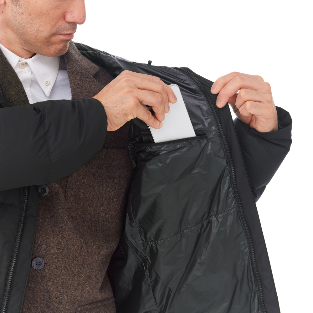 高い防風性と優れた防水透湿性を持つ素材「ウィンドストッパー®ファブリクス」で、高品質ダウンを包み込んだ軽量なミドル丈のコートです。コンパクトに収納できるため、寒冷地へ旅行する際などの持ち運びに便利です。