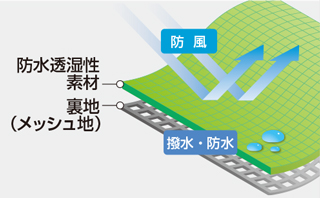 一部のモデルに透湿性が5,000g/m²・24hrs(JIS L-1099B-1法)未満の素材を使用しています。