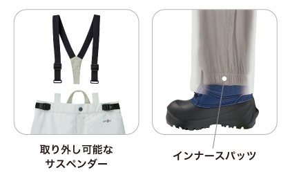 サスペンダー:ベルクロで取り外しでき、ジャケットを着たままでも用足しができます。
