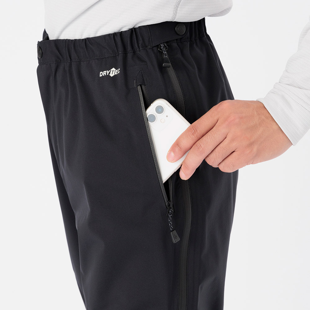 優れた防水透湿性素材ドライテック®を使用した軽量パンツです。防水仕様のオーバーパンツとして、一年を通じて携行可能。太ももとお尻にゆとりを持たせたシルエットにより、下に履いたパンツとごわつきにくくなっています。サイドフルオープンジッパーを装備しているので、アイゼンを履いた状態でも着用できます。