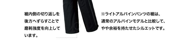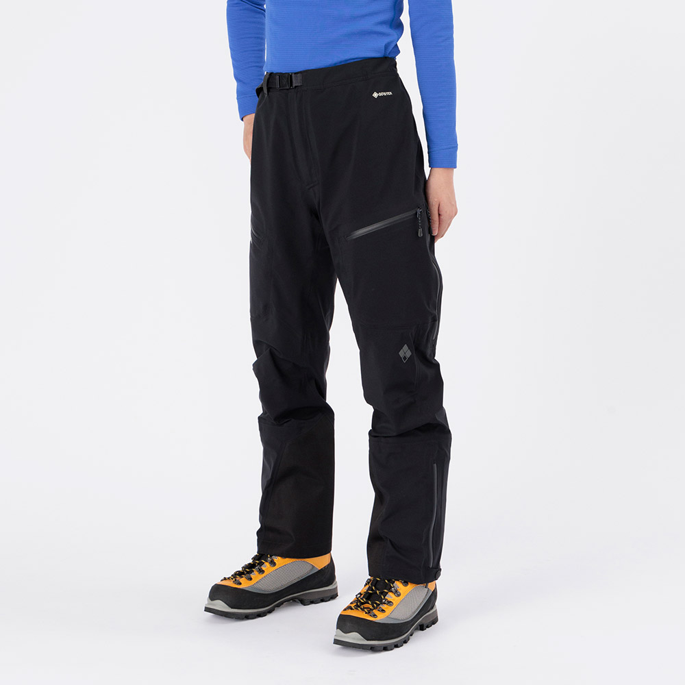 しなやかで軽量なゴアテックスファブリクスを使用したアルパインパンツです。裾のジッパーを開閉することで裾幅が調節可能なため、登山靴にもスキーブーツにも対応します。冬季登山から無雪期のトレッキングまで幅広いシーンで活躍します。