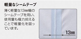 【特長】薄くて軽量な13mm幅のシームテープ / アクアテクト®ジッパー / サイドベンチレーション(片開き) / ボトムジッパー / インナースパッツ(靴紐などに留めるタブ付き) / エッジガード / 立体裁断 / 1WAYストレッチ / スタッフバック付き