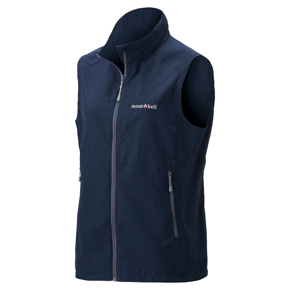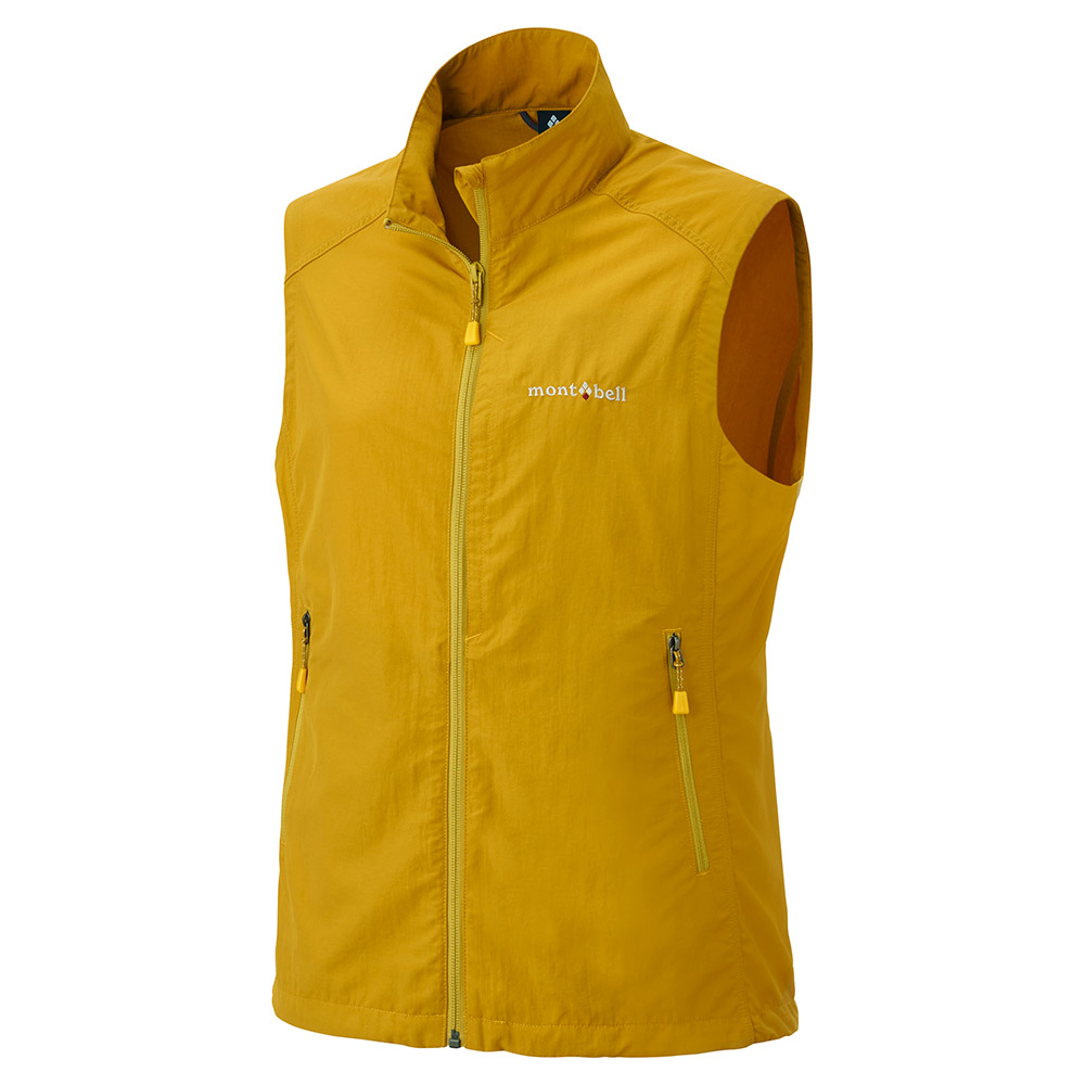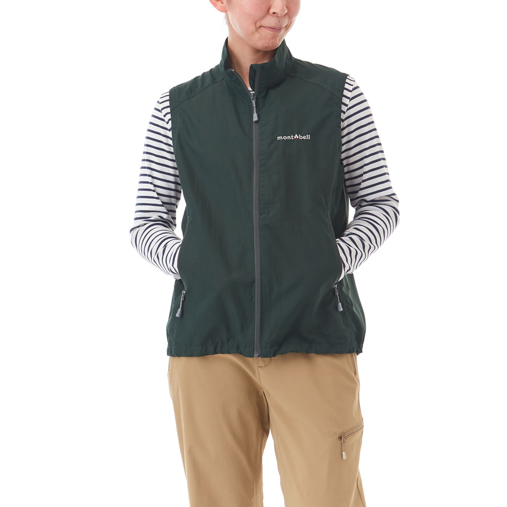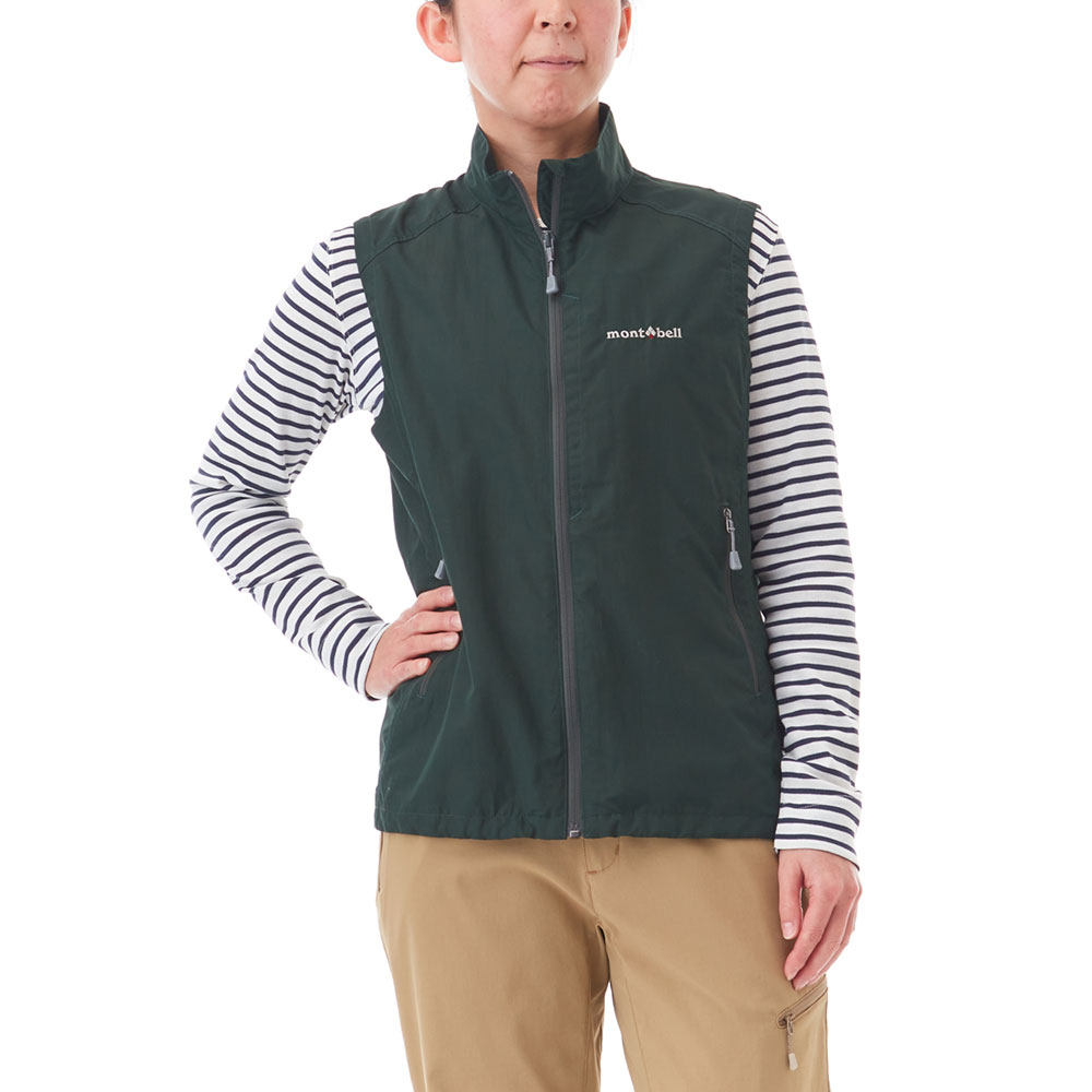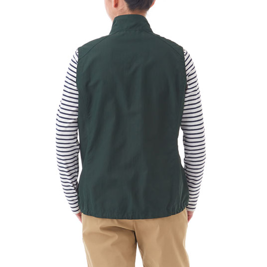 コットンのような柔らかさと肌触りを持つ薄手のナイロン生地を使用した、軽くてシンプルな防風ベストです。腰ポケット内のドローコードで、すそのフィット感を簡単に調節可能。首元の日焼け防止に役立つスタンドネック仕様です。